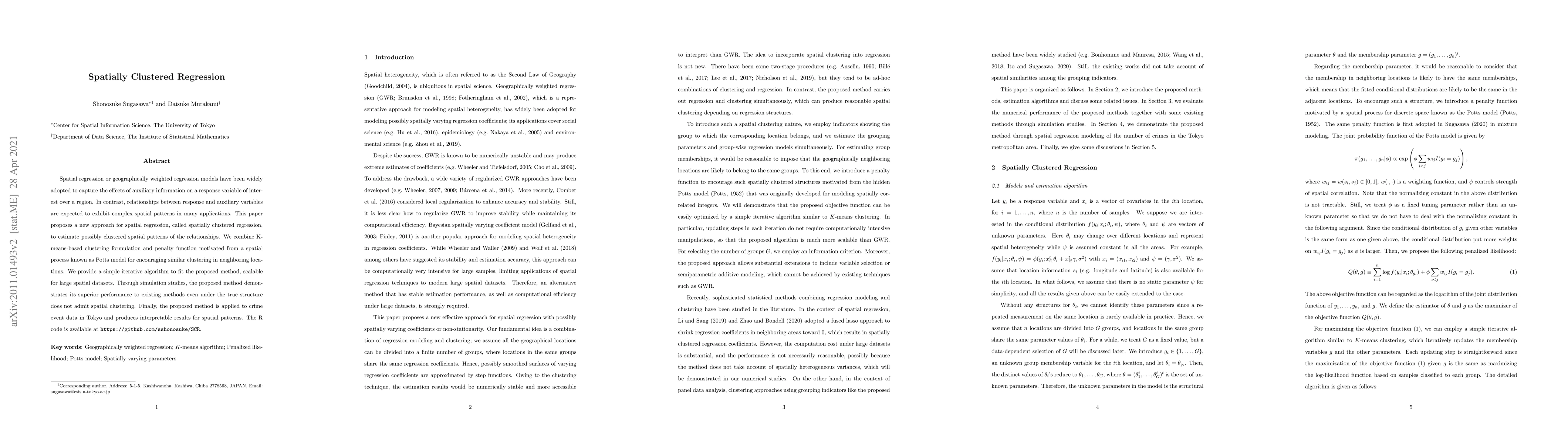 This paper introduces spatially clustered regression, a novel method combining K-means clustering and Potts model penalties to estimate clustered spatial patterns in relationships between response and auxiliary variables. The proposed iterative algorithm is scalable and outperforms existing methods in simulations, as demonstrated through its application to Tokyo crime event data.