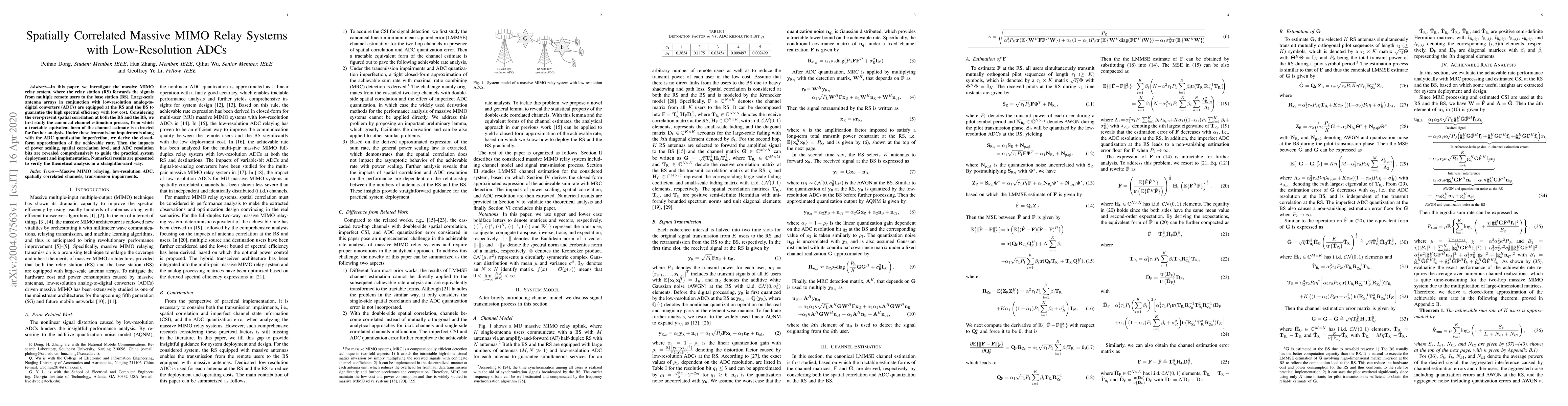 This paper explores massive MIMO relay systems with low-resolution ADCs, analyzing the impact of spatial correlation and ADC quantization on channel estimation and achievable rate. It provides a closed-form approximation of the rate and discusses the effects of power scaling, spatial correlation, and ADC resolution for practical deployment.