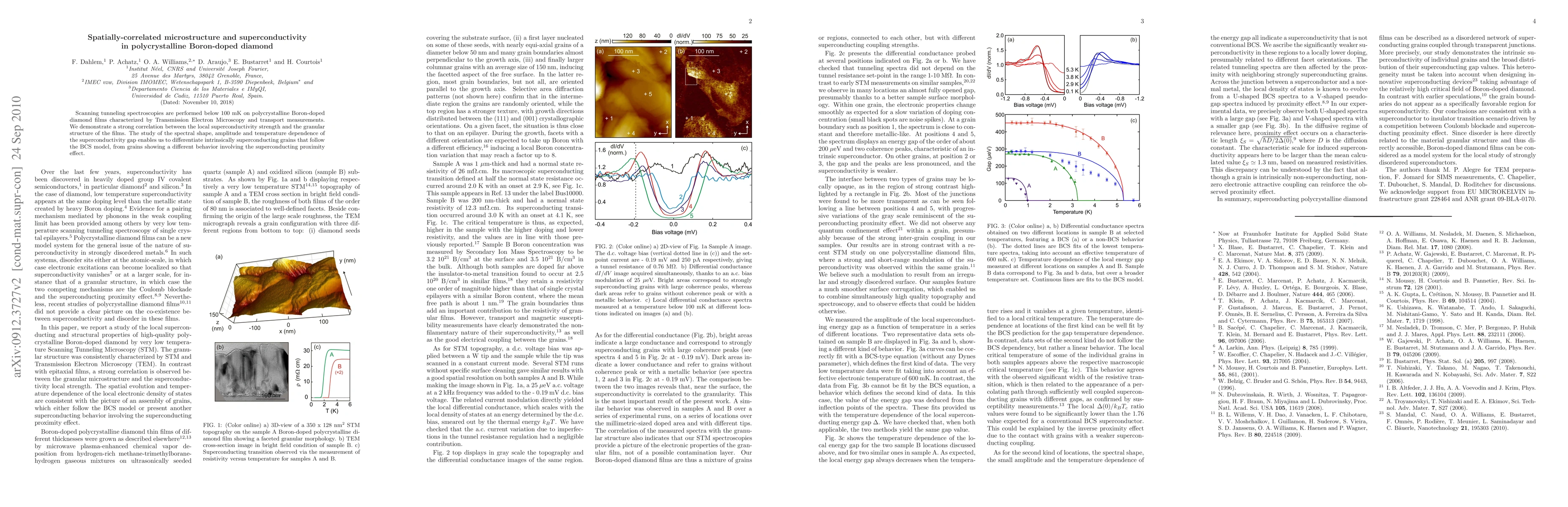 This paper investigates the spatially-correlated microstructure and superconductivity in polycrystalline boron-doped diamond using scanning tunneling spectroscopies. It reveals a strong link between local superconductivity strength and the granular structure, distinguishing grains that follow the BCS model from those exhibiting different behaviors due to the superconducting proximity effect.