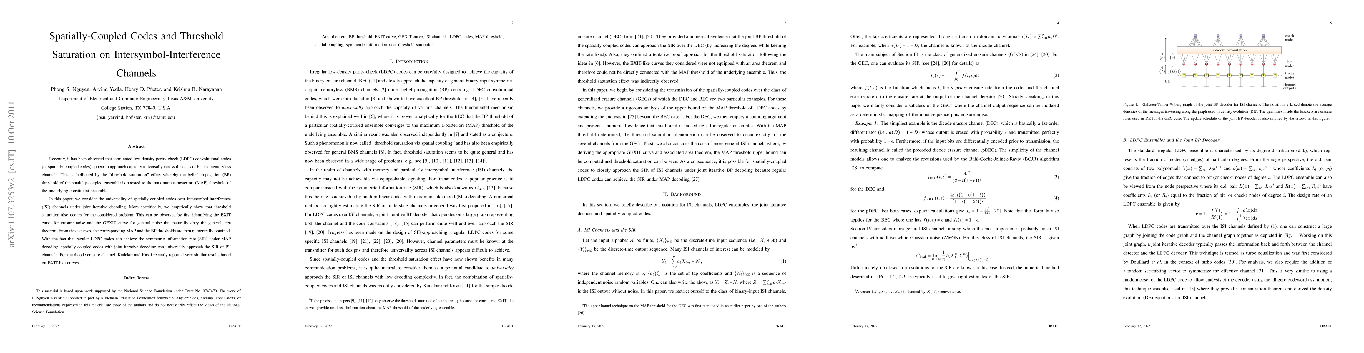 This paper investigates the performance of spatially-coupled codes on intersymbol-interference channels under joint iterative decoding, demonstrating the "threshold saturation" effect that boosts belief-propagation thresholds to maximum a-posteriori thresholds, enabling universal capacity approach. Empirical results show that these codes can achieve the symmetric information rate under MAP decoding.
