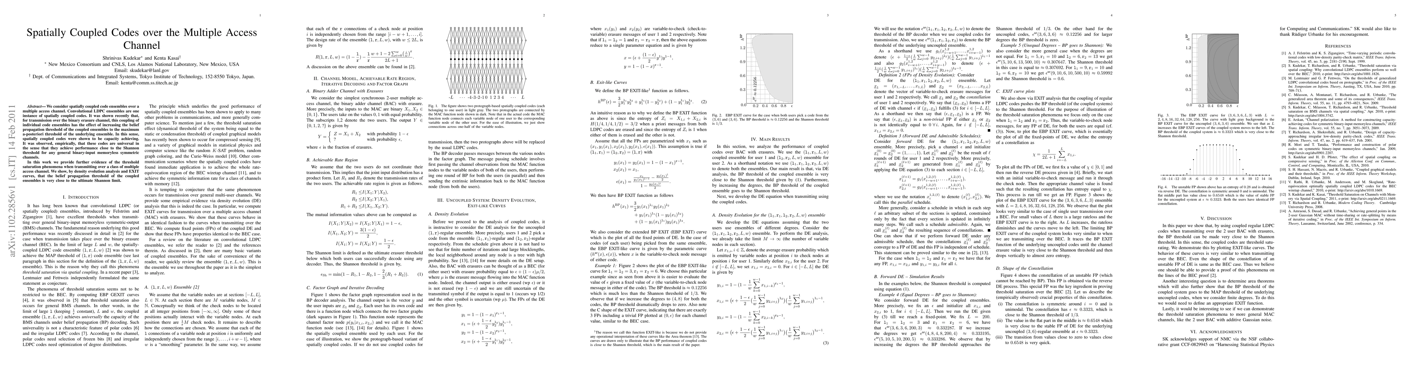 This paper investigates spatially coupled code ensembles over a multiple access channel, demonstrating that these codes achieve near-optimal performance close to the Shannon limit. Through density evolution analysis and EXIT curves, the study confirms that the belief propagation threshold of the coupled ensembles aligns closely with the theoretical maximum a-posteriori threshold.