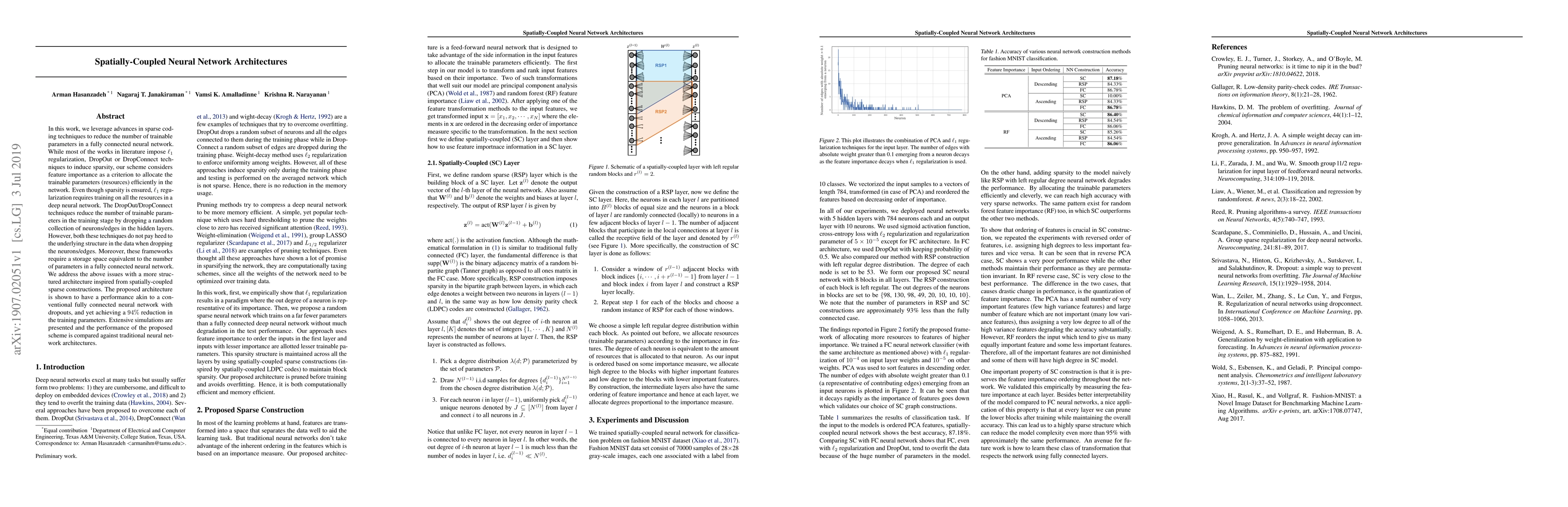 In this work, we leverage advances in sparse coding techniques to reduce the number of trainable parameters in a fully connected neural network. While most of the works in literature impose $\ell_1$ regularization, DropOut or DropConnect techniques to induce sparsity, our scheme considers feature importance as a criterion to allocate the trainable parameters (resources) efficiently in the network. Even though sparsity is ensured, $\ell_1$ regularization requires training on all the resources in a deep neural network. The DropOut/DropConnect techniques reduce the number of trainable parameters in the training stage by dropping a random collection of neurons/edges in the hidden layers. However, both these techniques do not pay heed to the underlying structure in the data when dropping the neurons/edges. Moreover, these frameworks require a storage space equivalent to the number of parameters in a fully connected neural network. We address the above issues with a more structured architecture inspired from spatially-coupled sparse constructions. The proposed architecture is shown to have a performance akin to a conventional fully connected neural network with dropouts, and yet achieving a $94\%$ reduction in the training parameters. Extensive simulations are presented and the performance of the proposed scheme is compared against traditional neural network architectures.