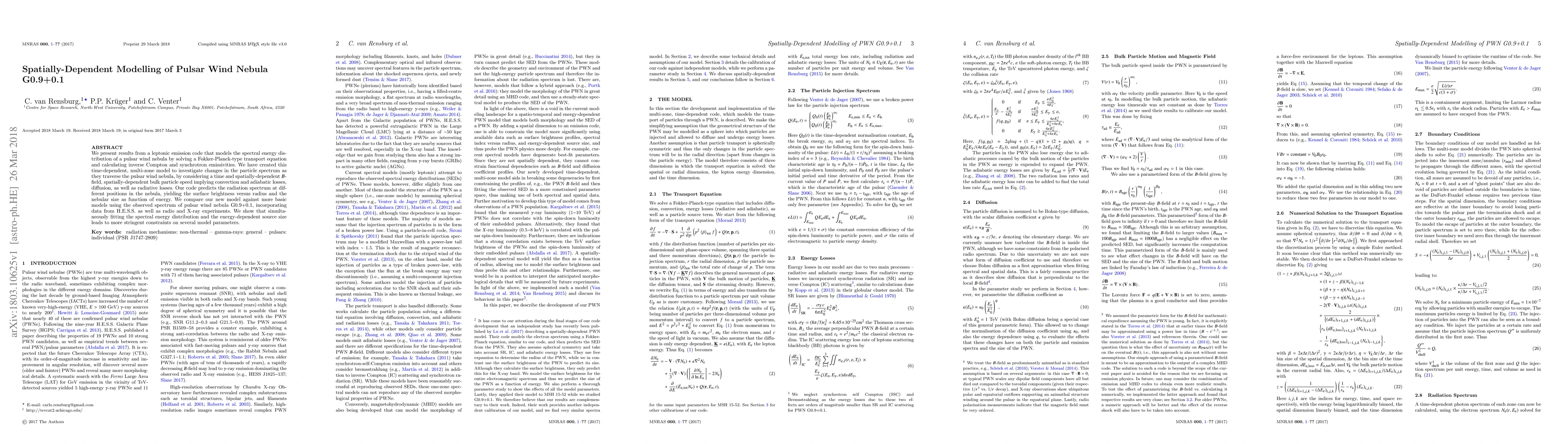 We present results from a leptonic emission code that models the spectral energy distribution of a pulsar wind nebula by solving a Fokker-Planck-type transport equation and calculating inverse Compton and synchrotron emissivities. We have created this time-dependent, multi-zone model to investigate changes in the particle spectrum as they traverse the pulsar wind nebula, by considering a time and spatially-dependent B-field, spatially-dependent bulk particle speed implying convection and adiabatic losses, diffusion, as well as radiative losses. Our code predicts the radiation spectrum at different positions in the nebula, yielding the surface brightness versus radius and the nebular size as function of energy. We compare our new model against more basic models using the observed spectrum of pulsar wind nebula G0.9+0.1, incorporating data from H.E.S.S. as well as radio and X-ray experiments. We show that simultaneously fitting the spectral energy distribution and the energy-dependent source size leads to more stringent constraints on several model parameters.