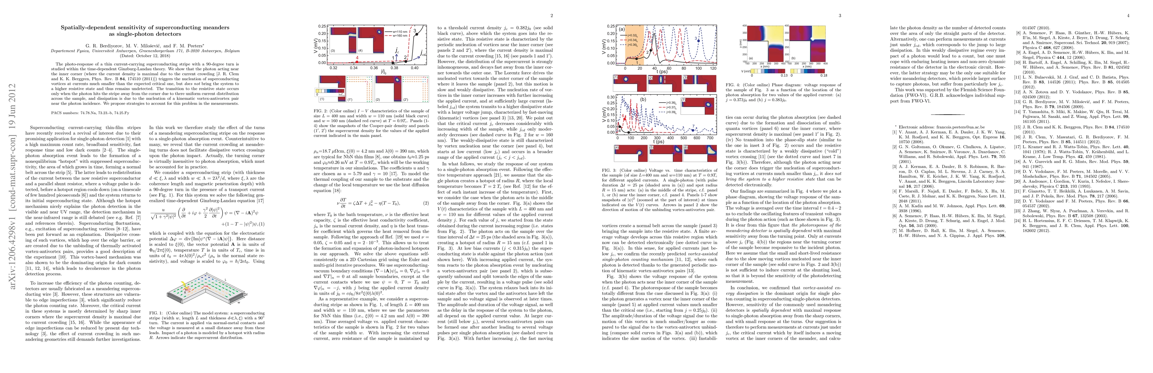 This research investigates the behavior of superconducting stripes as single-photon detectors, finding that photons near the corner of a 90-degree turn trigger vortex nucleation but don't cause a resistive state, while photons away from the corner induce dissipation through vortex-antivortex pairs. The study proposes strategies to address these measurement issues.