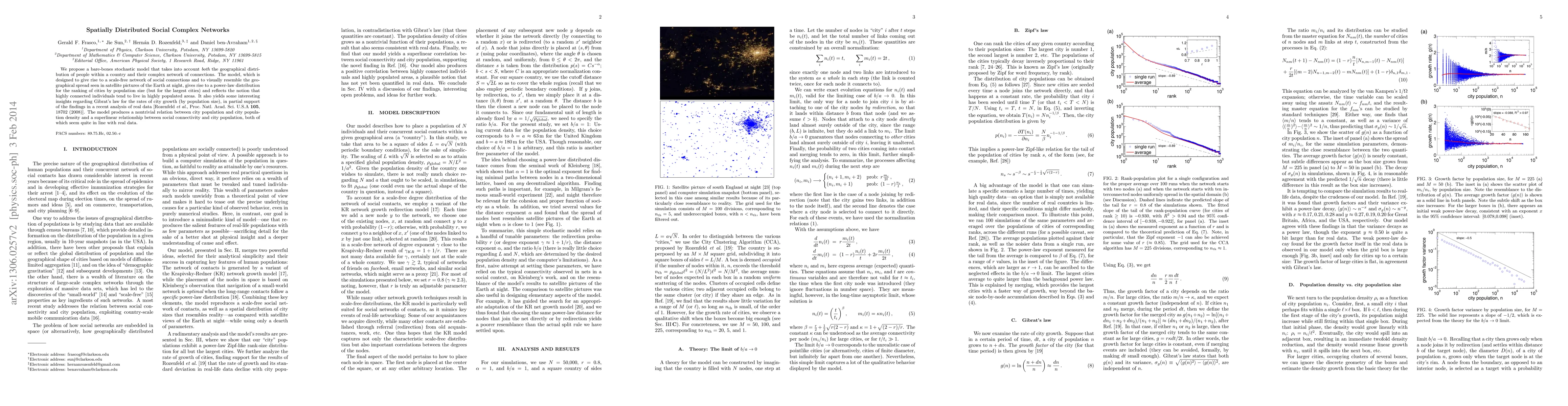We propose a bare-bones stochastic model that takes into account both the geographical distribution of people within a country and their complex network of connections. The model, which is designed to give rise to a scale-free network of social connections and to visually resemble the geographical spread seen in satellite pictures of the Earth at night, gives rise to a power-law distribution for the ranking of cities by population size (but for the largest cities) and reflects the notion that highly connected individuals tend to live in highly populated areas. It also yields some interesting insights regarding Gibrat's law for the rates of city growth (by population size), in partial support of the findings in a recent analysis of real data [Rozenfeld et al., Proc. Natl. Acad. Sci. U.S.A. 105, 18702 (2008)]. The model produces a nontrivial relation between city population and city population density and a superlinear relationship between social connectivity and city population, both of which seem quite in line with real data.