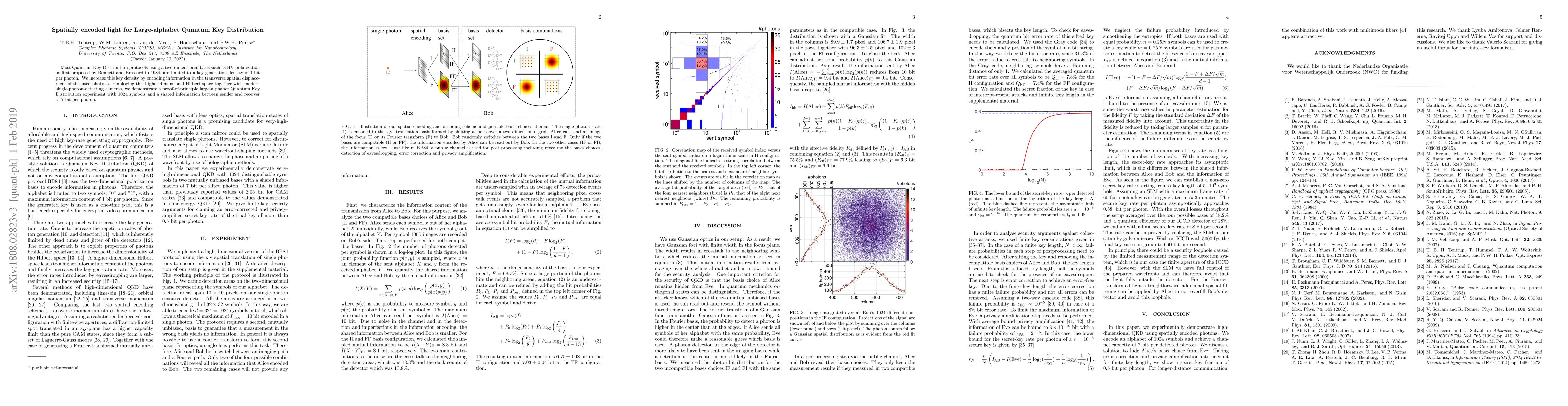 This paper proposes a novel Quantum Key Distribution protocol that uses spatially encoded light to increase key generation density to 7 bits per photon, surpassing traditional 1-bit per photon methods by employing a higher-dimensional Hilbert space and modern single-photon-detecting cameras. The experiment demonstrates a proof-of-principle with a large-alphabet of 1024 symbols.