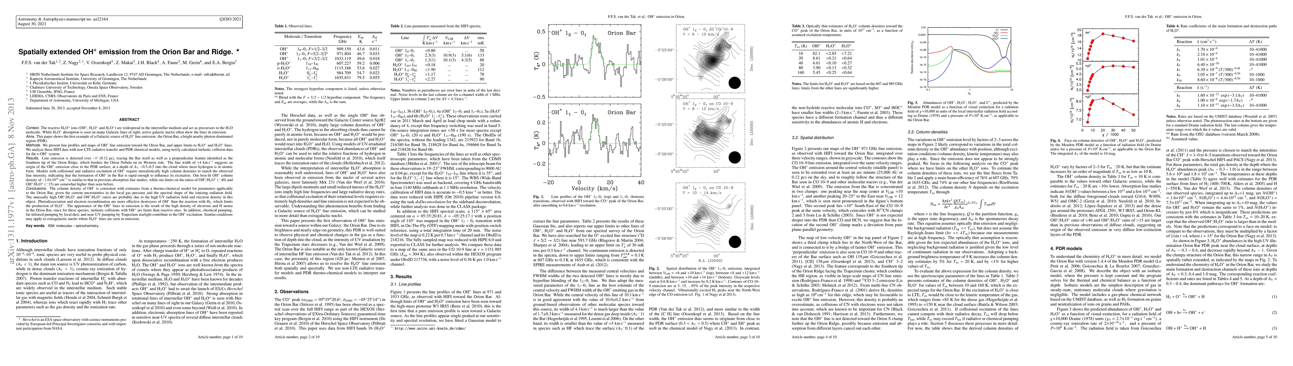 This paper reports the first detection of OH+ line emission from the Orion Bar, revealing spatially extended emission tracing the Bar and the Southern tip of the Orion Ridge. The high OH+/H2O+ and OH+/H3O+ ratios suggest rapid formation and unique excitation conditions influenced by high UV radiation and electron density.