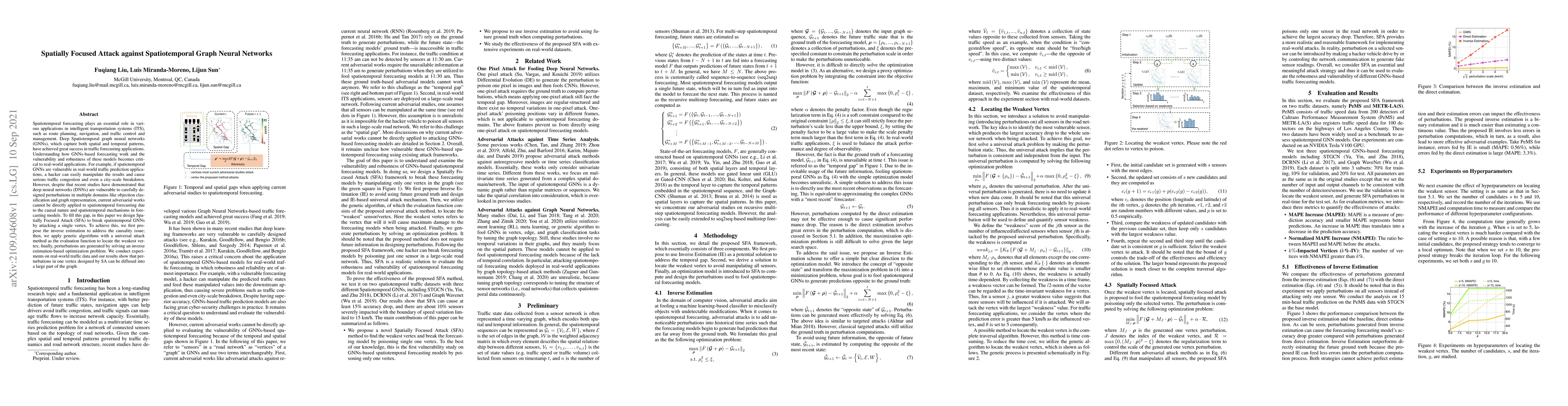 This paper introduces Spatially Focused Attack (SFA) to exploit vulnerabilities in spatiotemporal graph neural networks (GNNs) used for traffic forecasting. The proposed attack targets a single vertex, leveraging inverse estimation to address causality issues, and uses genetic algorithms to identify the weakest vertex, ultimately generating perturbations that can significantly impact the entire network's predictions.