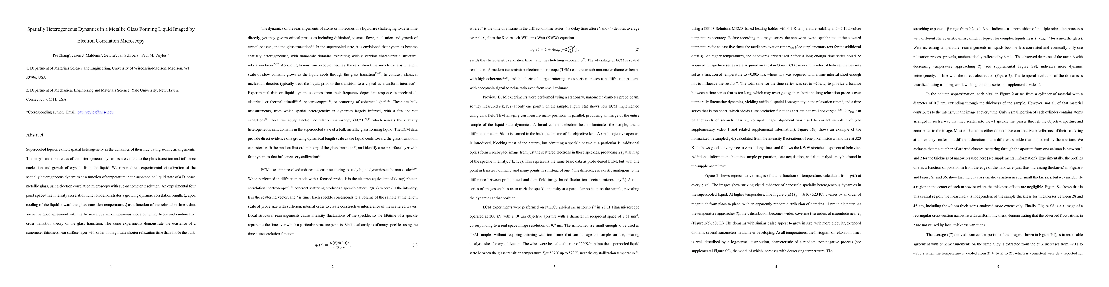 This paper reports on the direct visualization of spatially heterogeneous dynamics in a Pt-based metallic glass using electron correlation microscopy, revealing a growing dynamic correlation length upon cooling. The findings align with the Adam-Gibbs and random first order transition theories, and show a distinct near-surface layer with a significantly shorter relaxation time.