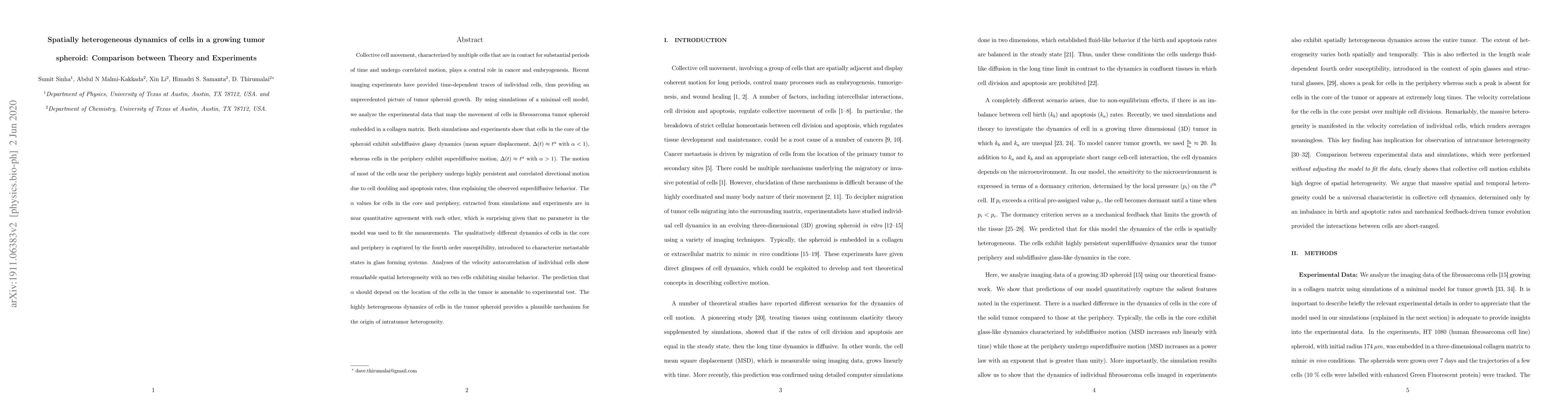 This paper compares theoretical simulations of cell movement in a growing tumor spheroid with experimental data, revealing distinct spatial dynamics: core cells show subdiffusive glassy motion, while periphery cells exhibit superdiffusive, persistent directional movement. The theoretical model accurately predicts these behaviors without parameter fitting.