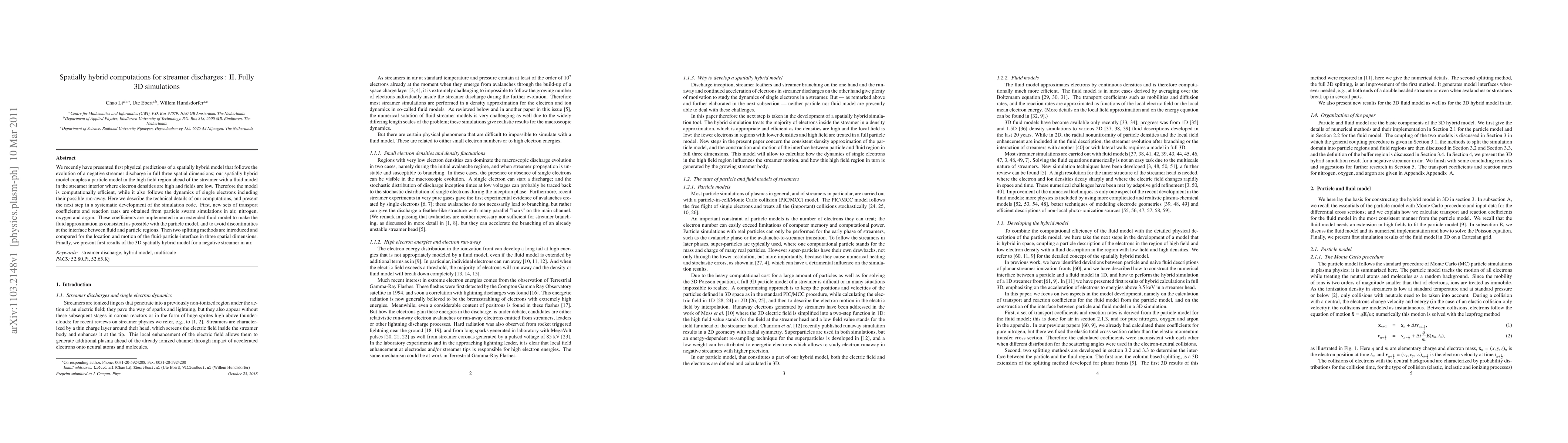 We recently have presented first physical predictions of a spatially hybrid model that follows the evolution of a negative streamer discharge in full three spatial dimensions; our spatially hybrid model couples a particle model in the high field region ahead of the streamer with a fluid model in the streamer interior where electron densities are high and fields are low. Therefore the model is computationally efficient, while it also follows the dynamics of single electrons including their possible run-away. Here we describe the technical details of our computations, and present the next step in a systematic development of the simulation code. First, new sets of transport coefficients and reaction rates are obtained from particle swarm simulations in air, nitrogen, oxygen and argon. These coefficients are implemented in an extended fluid model to make the fluid approximation as consistent as possible with the particle model, and to avoid discontinuities at the interface between fluid and particle regions. Then two splitting methods are introduced and compared for the location and motion of the fluid-particle-interface in three spatial dimensions. Finally, we present first results of the 3D spatially hybrid model for a negative streamer in air.