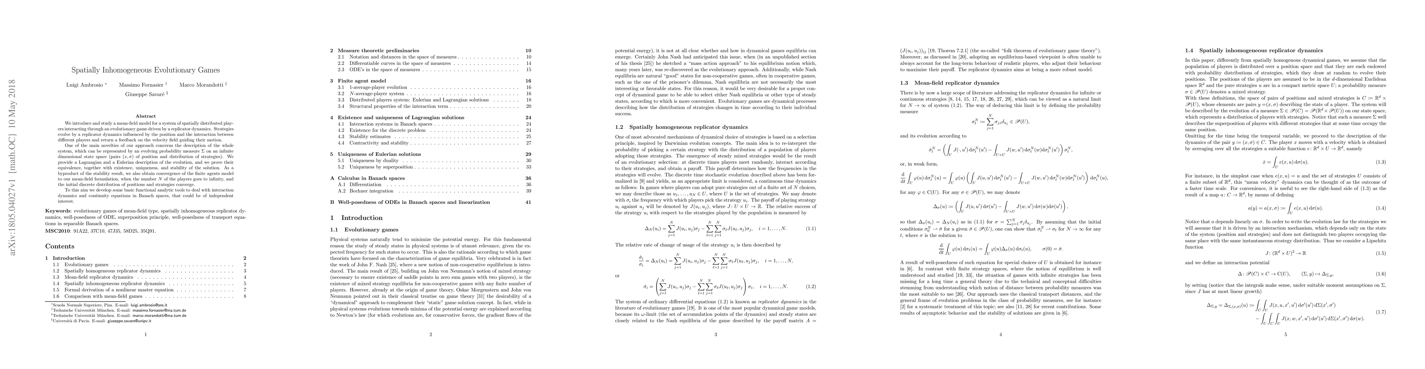 This research paper introduces a mean-field model for spatially distributed players in evolutionary games, showing how strategies evolve over time through replicator dynamics. It provides a Lagrangian and Eulerian description of the evolution and proves their equivalence, along with stability results and convergence to the mean-field formulation as the number of players increases.