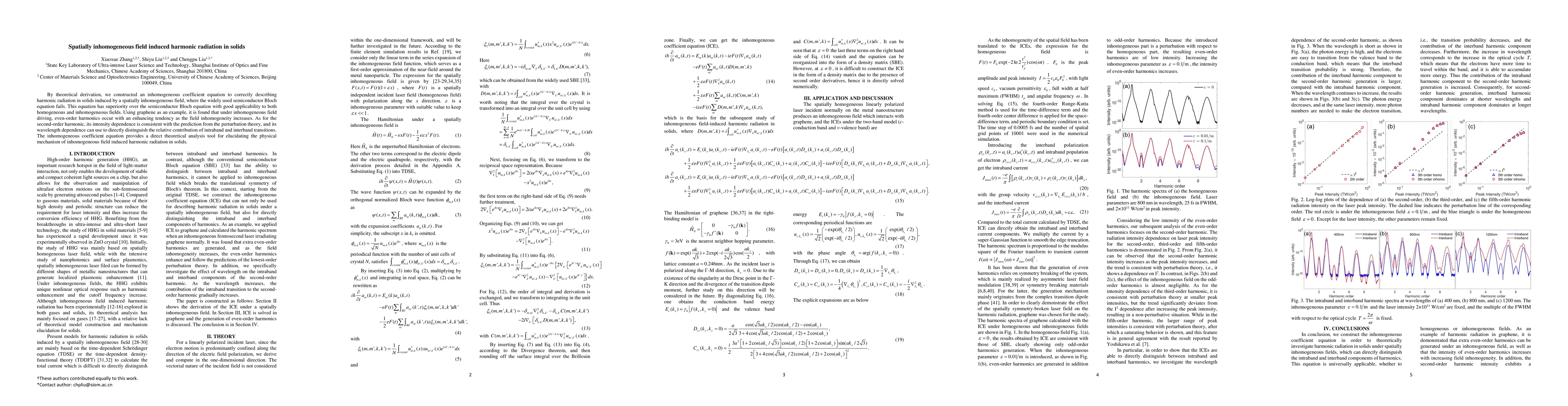 This research introduces an inhomogeneous coefficient equation for accurately describing harmonic radiation in solids under spatially inhomogeneous fields, surpassing the semiconductor Bloch equation's limitations. Using graphene as an example, it shows even-order harmonics increase with field inhomogeneity, providing a theoretical tool to understand harmonic generation mechanisms in solids.