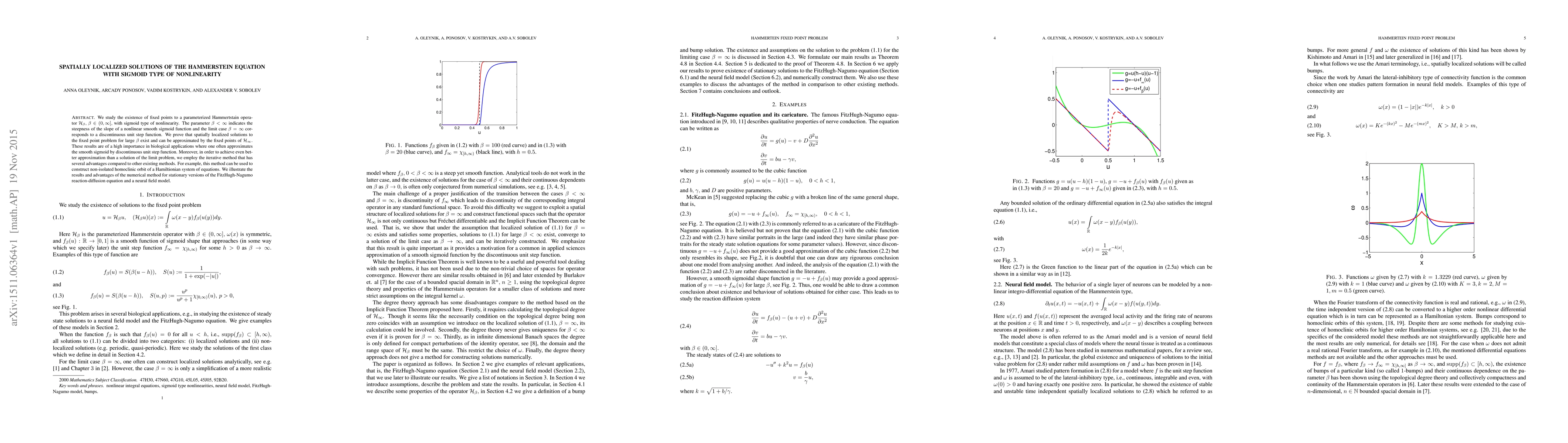We study the existence of fixed points to a parameterized Hammertstain operator $\cH_\beta,$ $\beta\in (0,\infty],$ with sigmoid type of nonlinearity. The parameter $\beta<\infty$ indicates the steepness of the slope of a nonlinear smooth sigmoid function and the limit case $\beta=\infty$ corresponds to a discontinuous unit step function. We prove that spatially localized solutions to the fixed point problem for large $\beta$ exist and can be approximated by the fixed points of $\cH_\infty.$ These results are of a high importance in biological applications where one often approximates the smooth sigmoid by discontinuous unit step function. Moreover, in order to achieve even better approximation than a solution of the limit problem, we employ the iterative method that has several advantages compared to other existing methods. For example, this method can be used to construct non-isolated homoclinic orbit of a Hamiltionian system of equations. We illustrate the results and advantages of the numerical method for stationary versions of the FitzHugh-Nagumo reaction-diffusion equation and a neural field model.