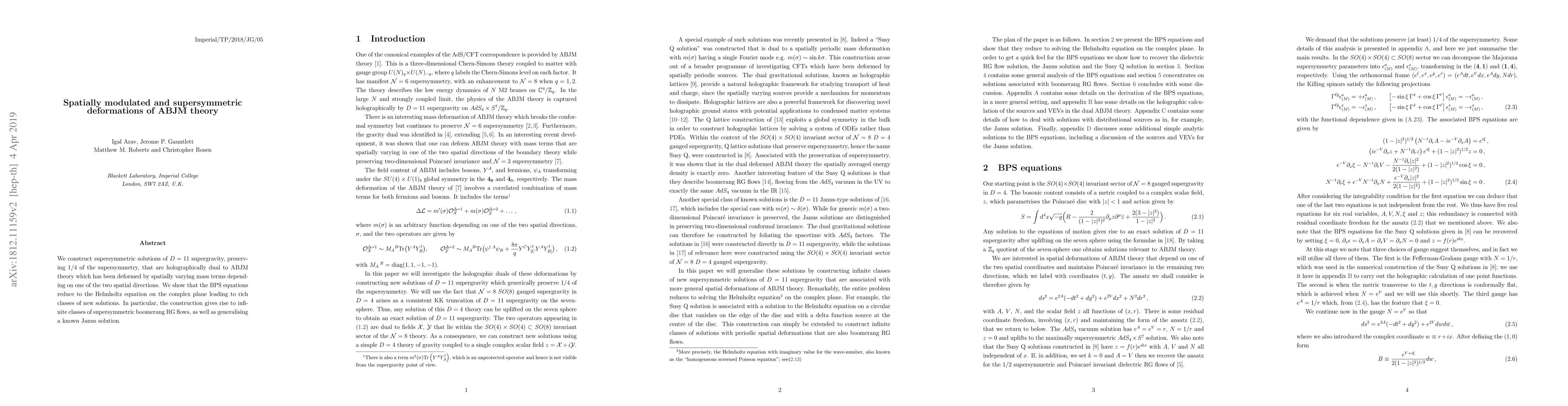 This paper constructs holographically dual supersymmetric solutions to deformed ABJM theory with spatially modulated mass terms, leading to new BPS solutions and infinite classes of supersymmetric boomerang RG flows. The BPS equations simplify to the Helmholtz equation, revealing rich new solution classes.
