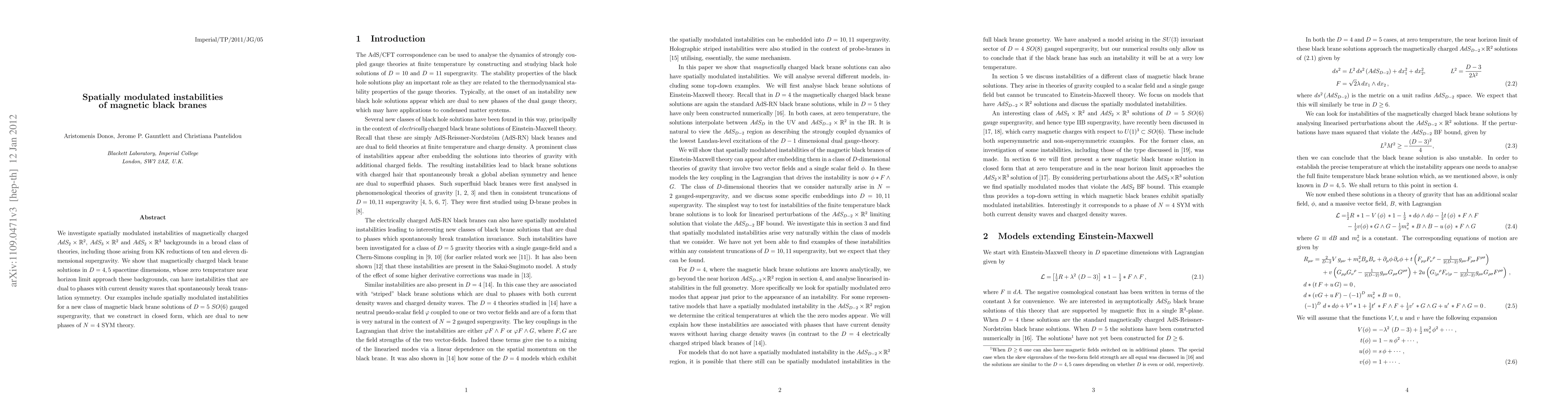 This research explores spatially modulated instabilities in magnetically charged black brane solutions within $AdS_{d}\times\mathbb{R}^{2}$ backgrounds, showing they can lead to phases with spontaneous translation symmetry breaking, dual to current density waves in N=4 SYM theory. It also introduces new magnetic black brane solutions in D=5 SO(6) gauged supergravity.