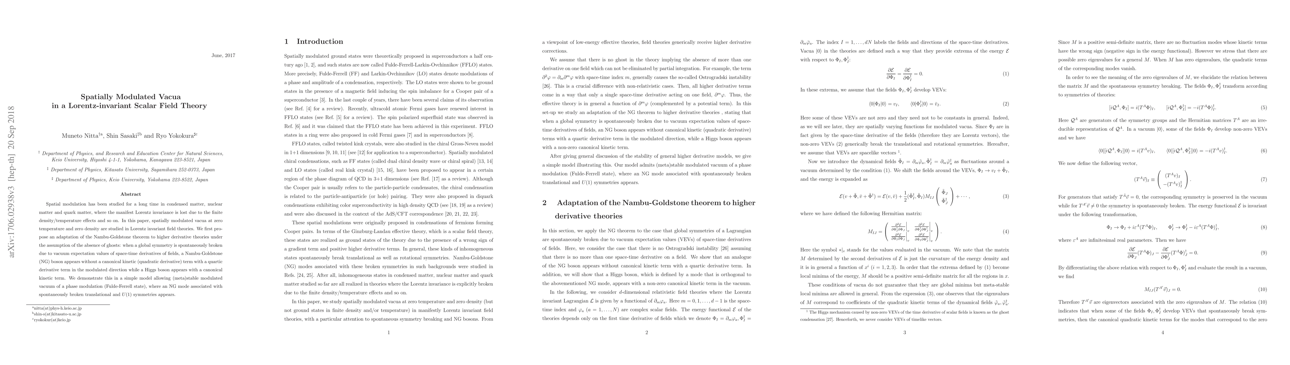 This paper investigates spatially modulated vacua in relativistic field theories, proposing an adaptation of the Nambu-Goldstone theorem for higher derivative theories. It introduces a model demonstrating a (meta)stable modulated vacuum with a Nambu-Goldstone boson and a Higgs boson, showcasing spontaneous symmetry breaking.
