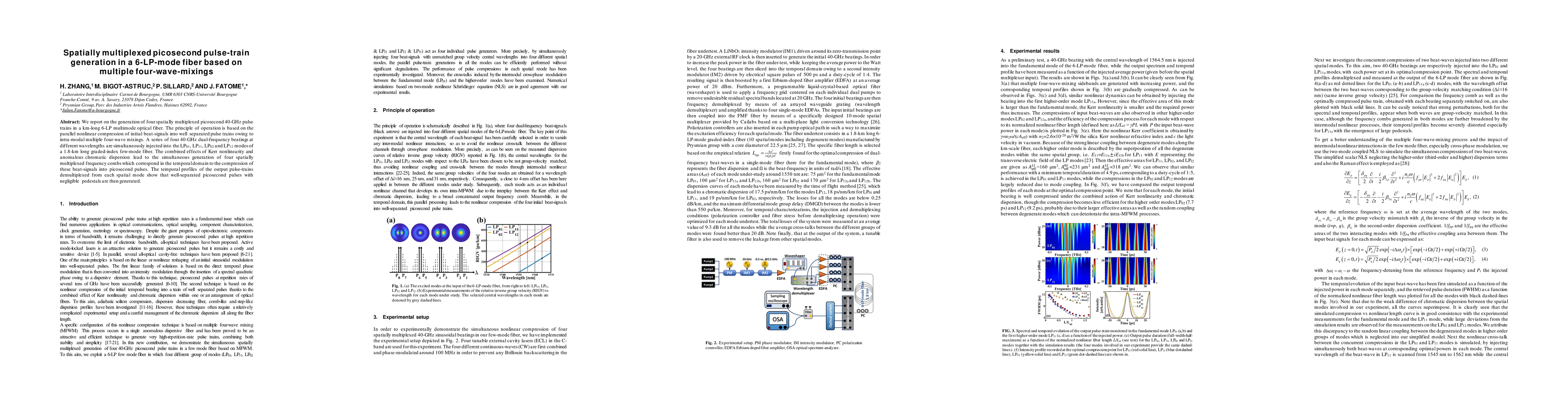 This paper describes the generation of four spatially multiplexed picosecond pulse trains in a 6-LP mode fiber through multiple four-wave mixings, utilizing nonlinear compression of initial beat-signals to produce well-separated picosecond pulses with minimal pedestals. The technique employs a km-long graded-index few-mode fiber and leverages Kerr nonlinearity and anomalous chromatic dispersion.