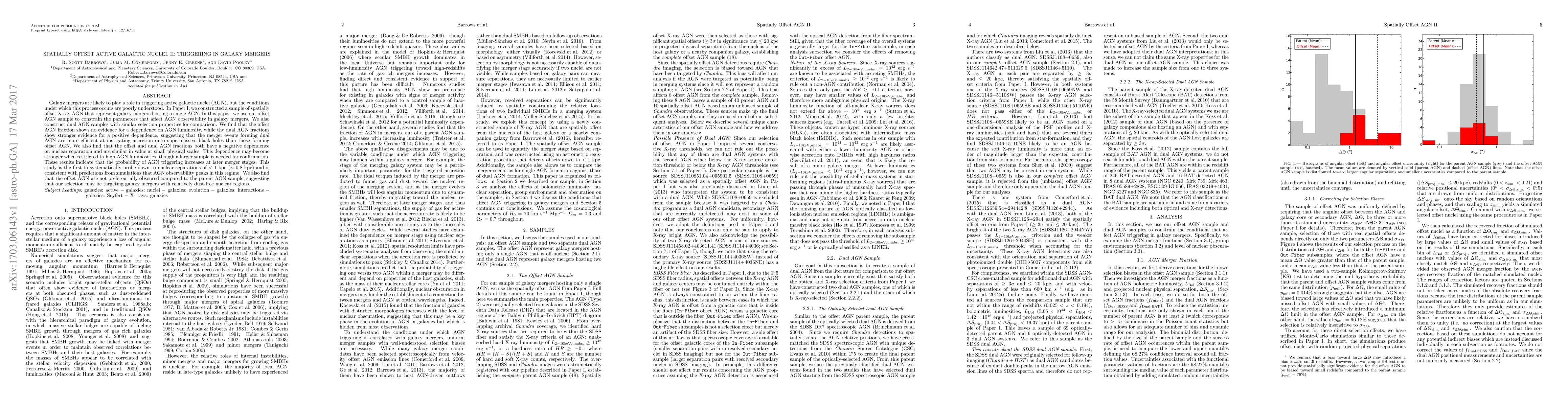 This paper investigates the triggering of active galactic nuclei (AGN) in galaxy mergers using a sample of spatially offset AGN. It finds that dual AGN fractions show a positive dependence on AGN luminosity, suggesting more efficient accretion in mergers forming dual AGN compared to those forming offset AGN. The study concludes that AGN triggering probability increases at later merger stages, especially at nuclear separations less than 1 kpc.