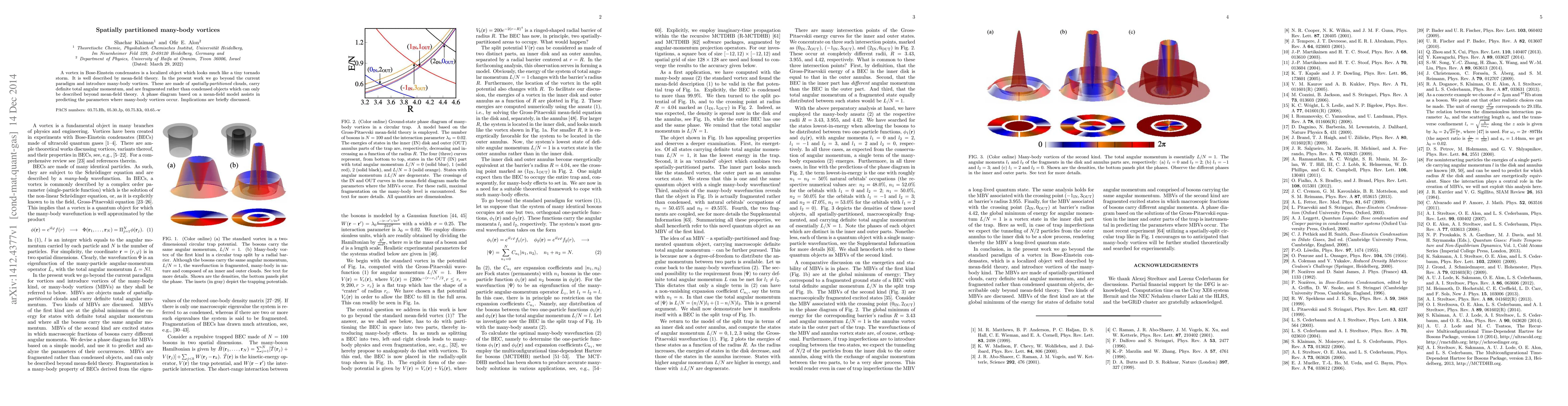 A vortex in Bose-Einstein condensates is a localized object which looks much like a tiny tornado storm. It is well described by mean-field theory. In the present work we go beyond the current paradigm and introduce many-body vortices. These are made of {\it spatially-partitioned} clouds, carry definite total angular momentum, and are fragmented rather than condensed objects which can only be described beyond mean-field theory. A phase diagram based on a mean-field model assists in predicting the parameters where many-body vortices occur. Implications are briefly discussed.