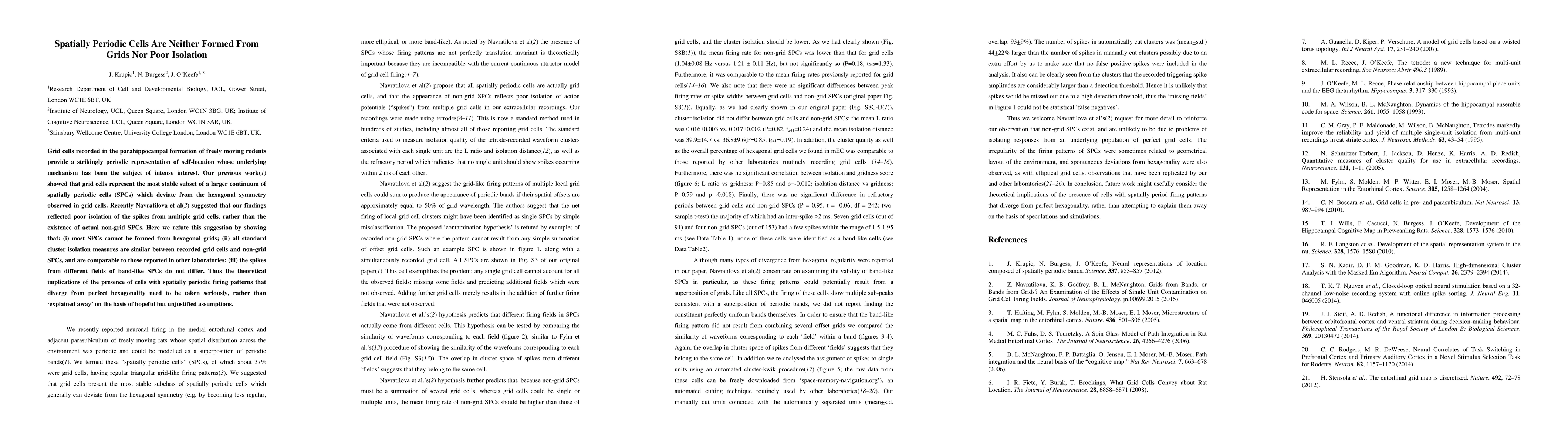 Grid cells recorded in the parahippocampal formation of freely moving rodents provide a strikingly periodic representation of self-location whose underlying mechanism has been the subject of intense interest. Our previous work(1) showed that grid cells represent the most stable subset of a larger continuum of spatially periodic cells (SPCs) which deviate from the hexagonal symmetry observed in grid cells. Recently Navratilova et al(2) suggested that our findings reflected poor isolation of the spikes from multiple grid cells, rather than the existence of actual non-grid SPCs. Here we refute this suggestion by showing that: (i) most SPCs cannot be formed from hexagonal grids; (ii) all standard cluster isolation measures are similar between recorded grid cells and non-grid SPCs, and are comparable to those reported in other laboratories; (iii) the spikes from different fields of band-like SPCs do not differ. Thus the theoretical implications of the presence of cells with spatially periodic firing patterns that diverge from perfect hexagonality need to be taken seriously, rather than explained away on the basis of hopeful but unjustified assumptions.