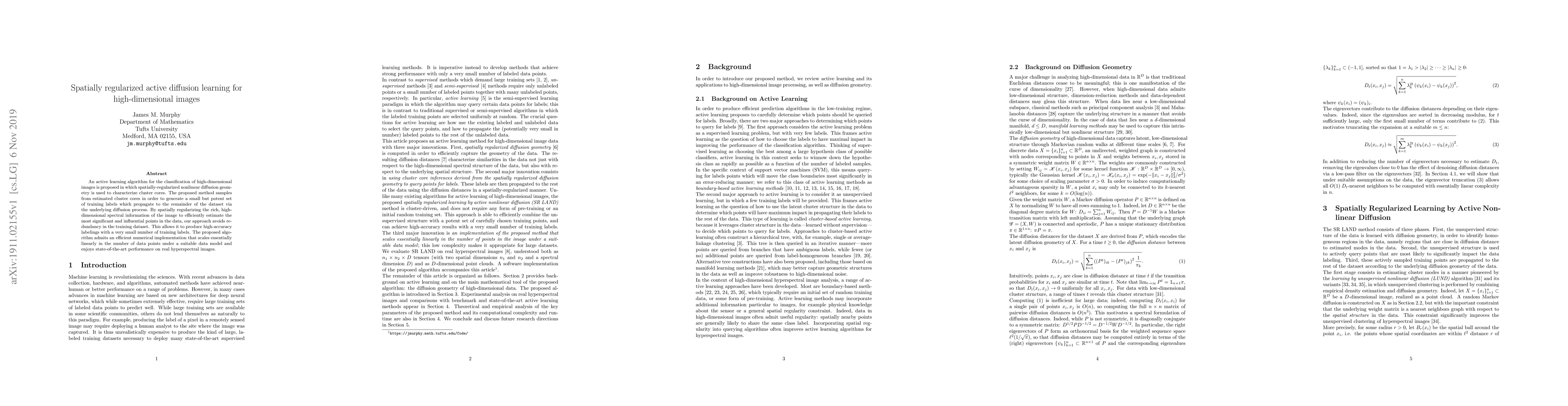 A new active learning algorithm uses spatially-regularized nonlinear diffusion geometry to select a small set of training labels for high-dimensional images, achieving high accuracy with minimal labeled data.