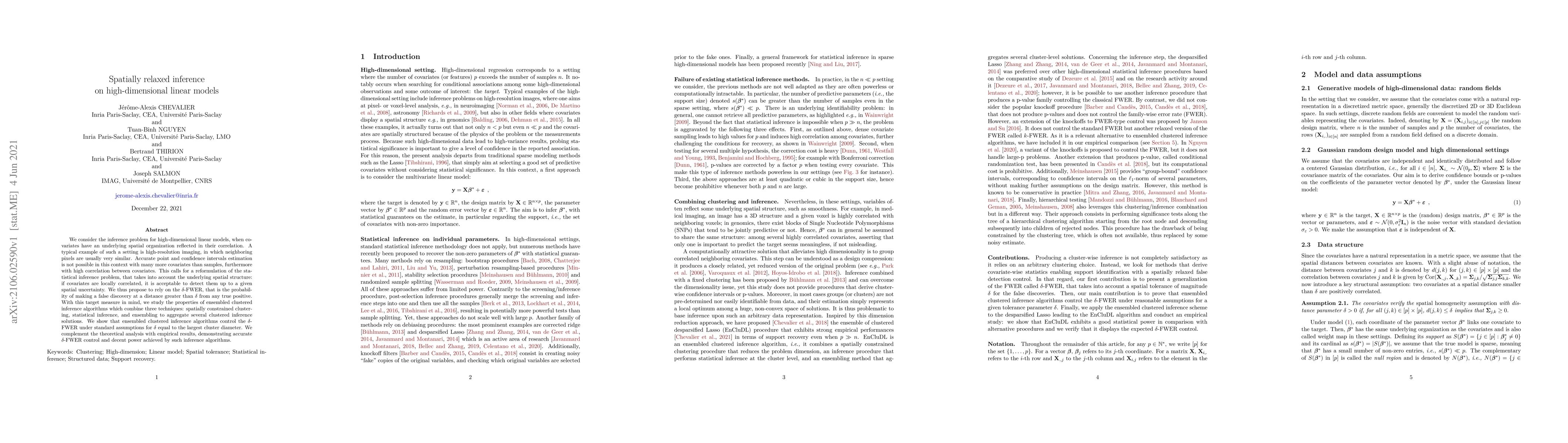 We consider the inference problem for high-dimensional linear models, when covariates have an underlying spatial organization reflected in their correlation. A typical example of such a setting is high-resolution imaging, in which neighboring pixels are usually very similar. Accurate point and confidence intervals estimation is not possible in this context with many more covariates than samples, furthermore with high correlation between covariates. This calls for a reformulation of the statistical inference problem, that takes into account the underlying spatial structure: if covariates are locally correlated, it is acceptable to detect them up to a given spatial uncertainty. We thus propose to rely on the $\delta$-FWER, that is the probability of making a false discovery at a distance greater than $\delta$ from any true positive. With this target measure in mind, we study the properties of ensembled clustered inference algorithms which combine three techniques: spatially constrained clustering, statistical inference, and ensembling to aggregate several clustered inference solutions. We show that ensembled clustered inference algorithms control the $\delta$-FWER under standard assumptions for $\delta$ equal to the largest cluster diameter. We complement the theoretical analysis with empirical results, demonstrating accurate $\delta$-FWER control and decent power achieved by such inference algorithms.