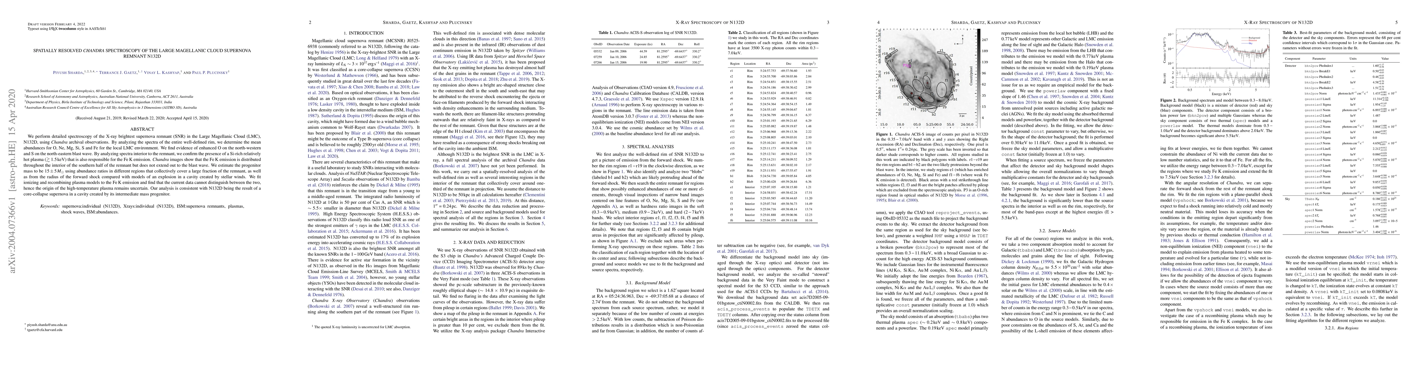 This paper uses Chandra X-ray observations to analyze the supernova remnant N132D in the LMC, determining enhanced O and S abundances in specific regions and identifying a Si-rich hot plasma responsible for Fe K emission. The progenitor mass is estimated to be $15\pm5\,M_{\odot}$, but the origin of the high-temperature plasma remains uncertain.