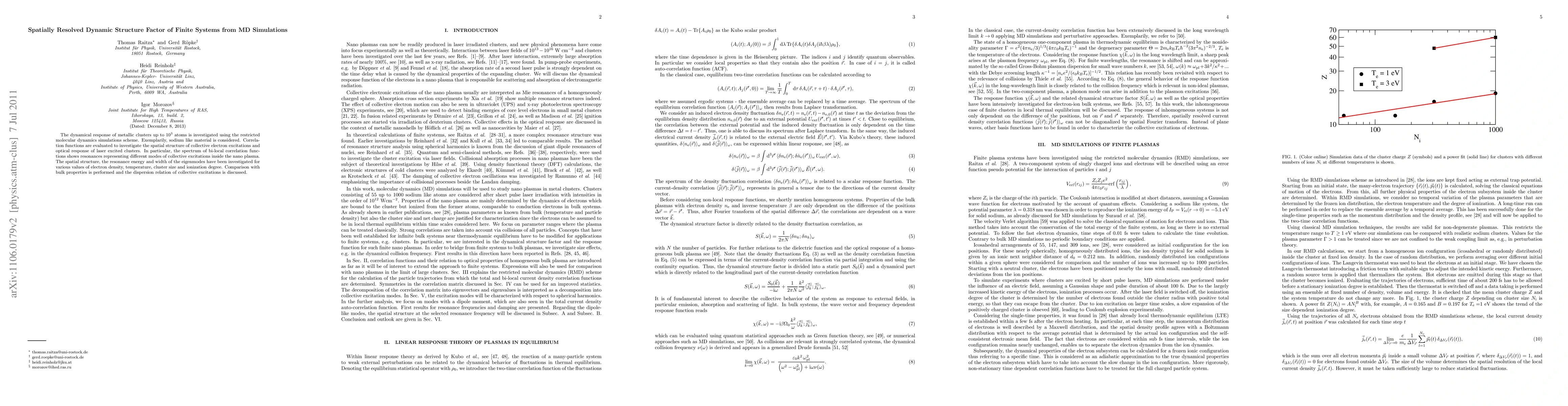The dynamical response of metallic clusters up to $10^3$ atoms is investigated using the restricted molecular dynamics simulations scheme. Exemplarily, sodium like material is considered. Correlation functions are evaluated to investigate the spatial structure of collective electron excitations and optical response of laser excited clusters. In particular, the spectrum of bi-local correlation functions shows resonances representing different modes of collective excitations inside the nano plasma. The spatial structure, the resonance energy and width of the eigenmodes have been investigated for various values of electron density, temperature, cluster size and ionization degree. Comparison with bulk properties is performed and the dispersion relation of collective excitations is discussed.