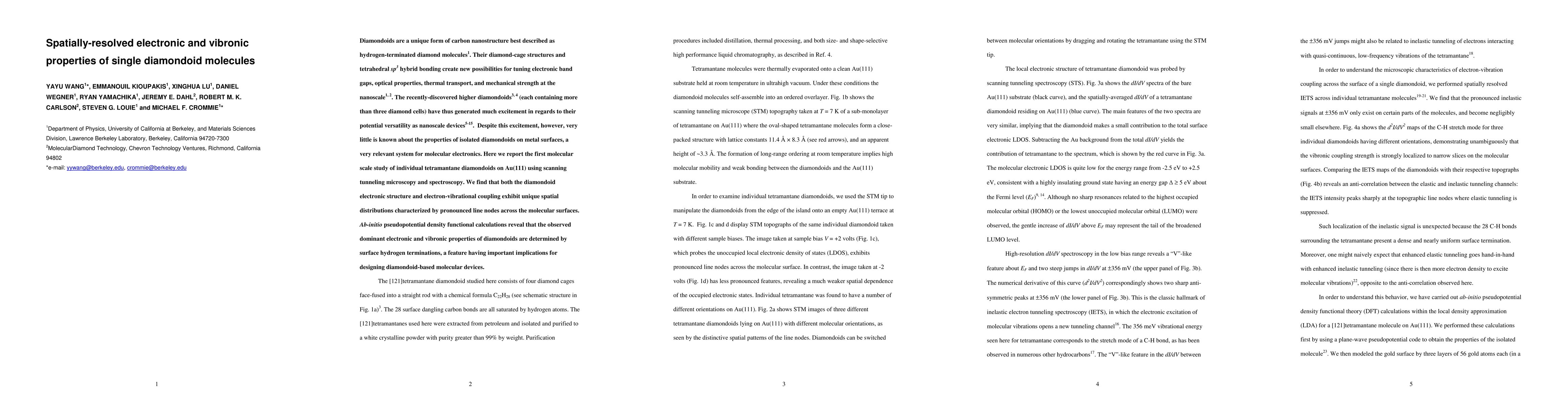 This study investigates the electronic and vibronic properties of individual tetramantane diamondoids on Au(111) using scanning tunneling microscopy and spectroscopy. The findings reveal unique spatial distributions of electronic structure and electron-vibrational coupling, with significant implications for designing nanoscale diamondoid-based devices.