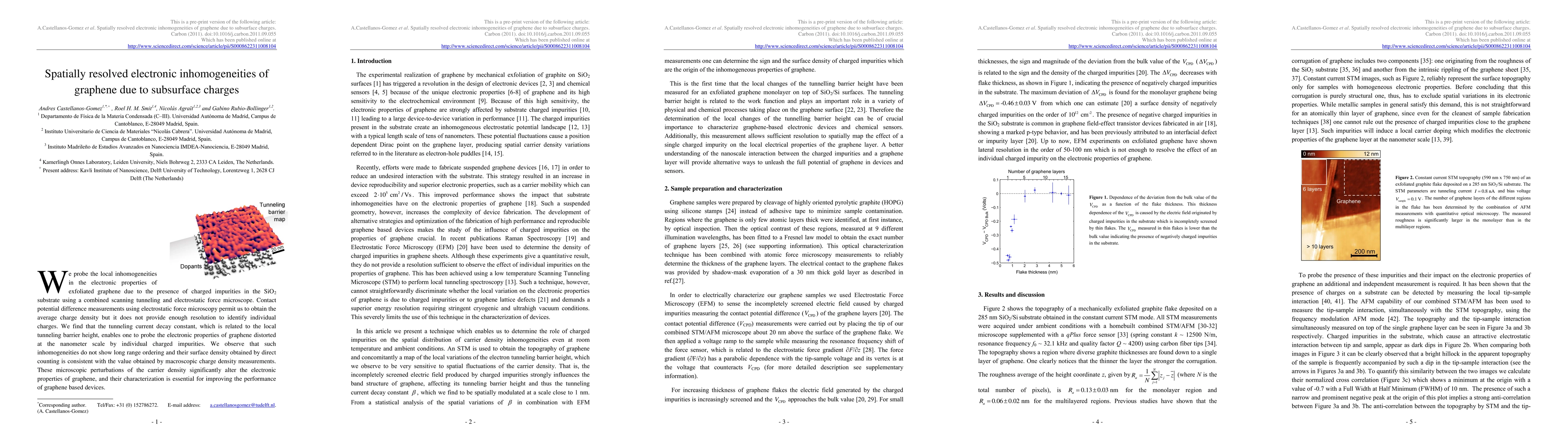 The paper presents a novel approach to characterize local electronic inhomogeneities in graphene using a combined STM/AFM technique, focusing on the tunneling current decay constant as a sensitive probe for subsurface charges.