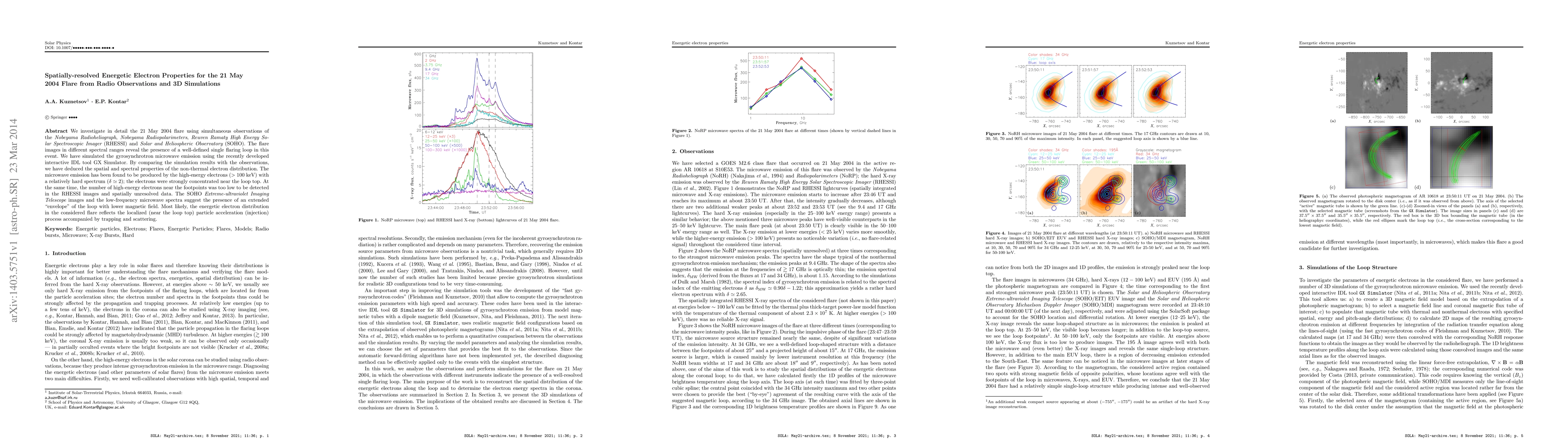 We investigate in detail the 21 May 2004 flare using simultaneous observations of the Nobeyama Radioheliograph, Nobeyama Radiopolarimeters, Reuven Ramaty High Energy Solar Spectroscopic Imager (RHESSI) and Solar and Heliospheric Observatory (SOHO). The flare images in different spectral ranges reveal the presence of a well-defined single flaring loop in this event. We have simulated the gyrosynchrotron microwave emission using the recently developed interactive IDL tool GX Simulator. By comparing the simulation results with the observations, we have deduced the spatial and spectral properties of the non-thermal electron distribution. The microwave emission has been found to be produced by the high-energy electrons ($>100$ keV) with a relatively hard spectrum ($\delta\simeq 2$); the electrons were strongly concentrated near the loop top. At the same time, the number of high-energy electrons near the footpoints was too low to be detected in the RHESSI images and spatially unresolved data. The SOHO Extreme-ultraviolet Imaging Telescope images and the low-frequency microwave spectra suggest the presence of an extended "envelope" of the loop with lower magnetic field. Most likely, the energetic electron distribution in the considered flare reflects the localized (near the loop top) particle acceleration (injection) process accompanied by trapping and scattering.