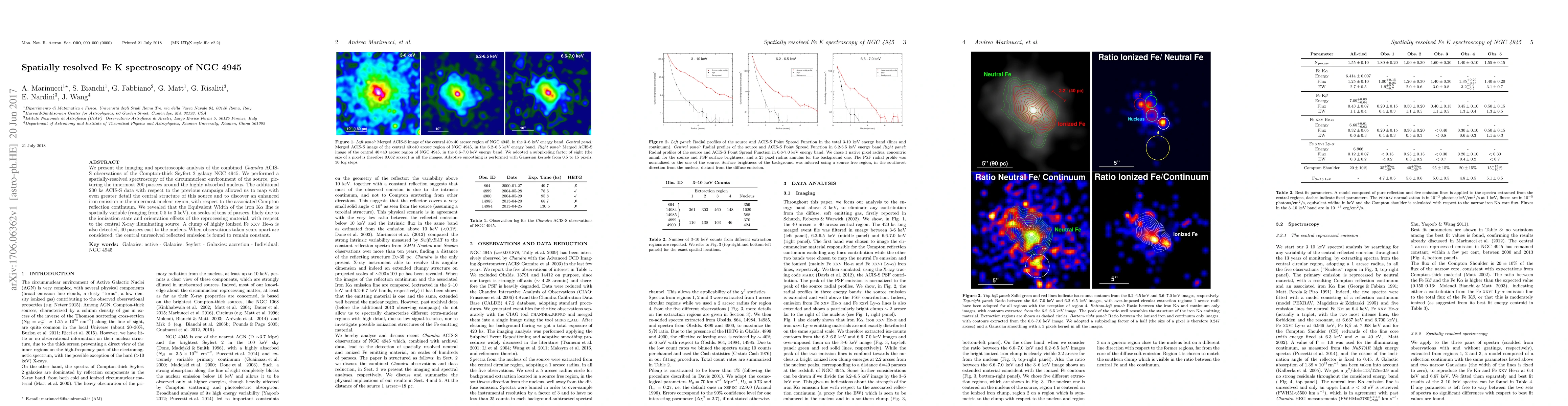 We present the imaging and spectroscopic analysis of the combined Chandra ACIS-S observations of the Compton-thick Seyfert 2 galaxy NGC 4945. We performed a spatially-resolved spectroscopy of the circumnuclear environment of the source, picturing the innermost 200 parsecs around the highly absorbed nucleus. The additional 200 ks ACIS-S data with respect to the previous campaign allowed us to map with even greater detail the central structure of this source and to discover an enhanced iron emission in the innermost nuclear region, with respect to the associated Compton reflection continuum. We revealed that the Equivalent Width of the iron K$\alpha$ line is spatially variable (ranging from 0.5 to 3 keV), on scales of tens of parsecs, likely due to the ionization state and orientation effects of the reprocessing material, with respect to the central X-ray illuminating source. A clump of highly ionized Fe XXV He-$\alpha$ is also detected, 40 parsecs east to the nucleus. When observations taken years apart are considered, the central unresolved reflected emission is found to remain constant.
