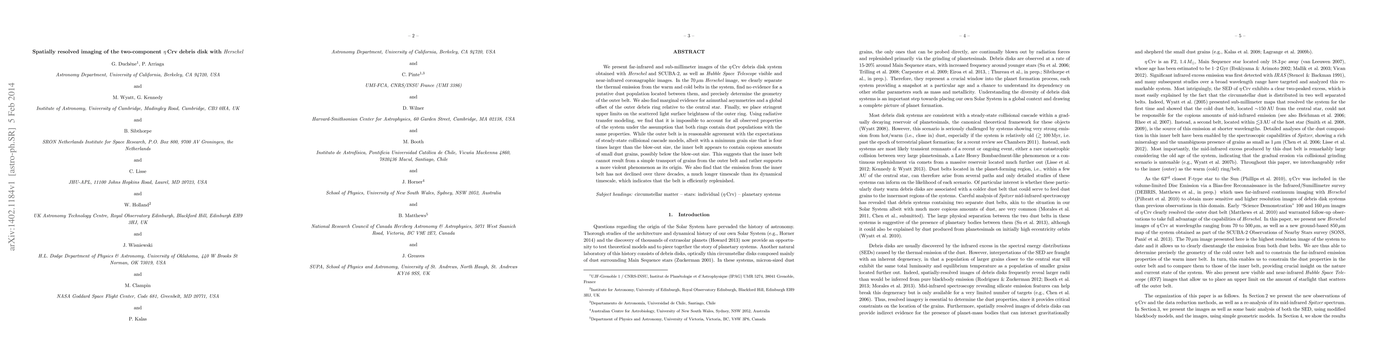 We present far-infrared and sub-millimeter images of the eta Crv debris disk system obtained with Herschel and SCUBA-2, as well as Hubble Space Telescope visible and near-infrared coronagraphic images. In the 70 micron Herschel image, we clearly separate the thermal emission from the warm and cold belts in the system, find no evidence for a putative dust population located between them, and precisely determine the geometry of the outer belt. We also find marginal evidence for azimuthal asymmetries and a global offset of the outer debris ring relative to the central star. Finally, we place stringent upper limits on the scattered light surface brightness of the outer ring. Using radiative transfer modeling, we find that it is impossible to account for all observed properties of the system under the assumption that both rings contain dust populations with the same properties. While the outer belt is in reasonable agreement with the expectations of steady-state collisional cascade models, albeit with a minimum grain size that is four times larger than the blow-out size, the inner belt appears to contain copious amounts of small dust grains, possibly below the blow-out size. This suggests that the inner belt cannot result from a simple transport of grains from the outer belt and rather supports a more violent phenomenon as its origin. We also find that the emission from the inner belt has not declined over three decades, a much longer timescale than its dynamical timescale, which indicates that the belt is efficiently replenished.