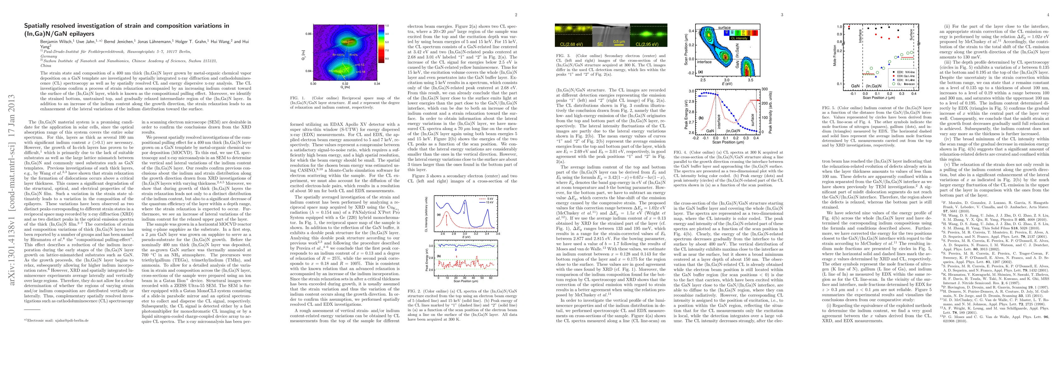 This paper investigates the strain and composition variations in a 400 nm thick (In,Ga)N layer grown on GaN via metal-organic chemical vapor deposition. The study reveals a compositional pulling effect, with strain relaxation and increasing indium content toward the surface, identifying a strained bottom, unstrained top, and gradually relaxed intermediate region.
