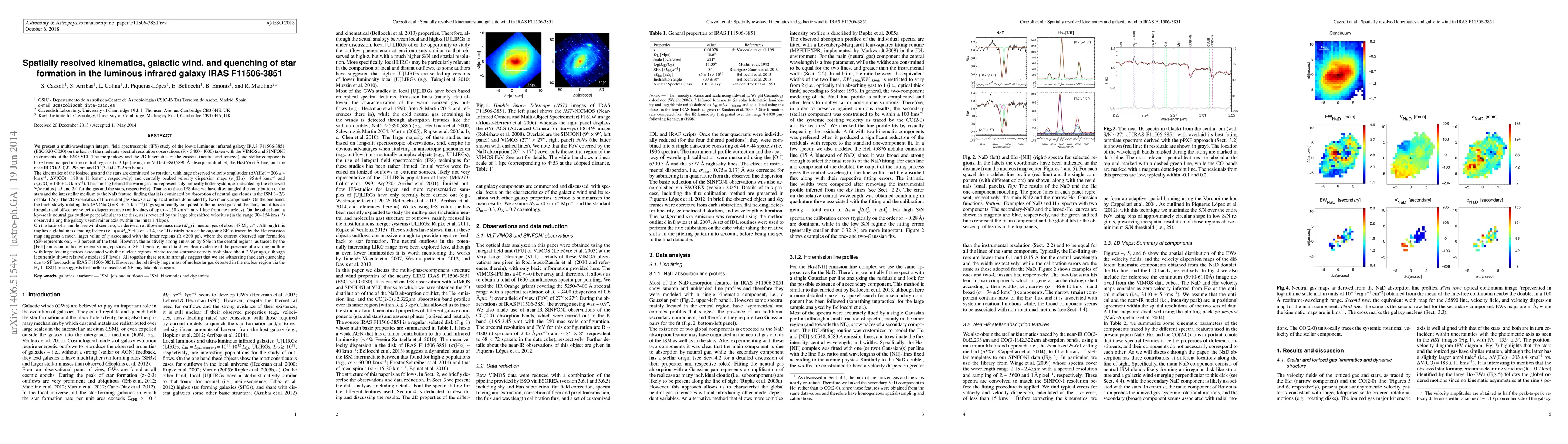 We present a multi-wavelength integral field spectroscopic study of the low-z LIRG IRAS F11506-3851, on the basis of VIMOS and SINFONI (ESO-VLT) observations. The morphology and the 2D kinematics of the gaseous (neutral and ionized) and stellar components have been mapped using the NaD doublet, the H$\alpha$ line, and the near-IR CO(2-0) and CO(3-1) bands. The kinematics of the ionized gas and the stars are dominated by rotation, with large observed velocity amplitudes and centrally peaked velocity dispersion maps. The stars lag behind the warm gas and represent a dynamically hotter system, as indicated by the observed dynamical ratios. Thanks to these IFS data we have disentangled the contribution of the stars and the ISM to the NaD feature, finding that it is dominated by the absorption of neutral gas clouds in the ISM. The neutral gas 2D kinematics shows a complex structure dominated by two components. On the one hand, the thick slowly rotating disk lags significantly compared to the ionized gas and the stars, with an irregular and off-center velocity dispersion map. On the other hand, a kpc-scale neutral gas outflow is observed along the semi-minor axis of the galaxy, as revealed by large blueshifted velocities (30-154 km/s). We derive an outflowing mass rate in neutral gas of about 48 $\dot{M_{\rm w}}$/yr. Although this implies a global mass loading factor of 1.4, the 2D distribution of the ongoing SF suggests a much larger value of mass loading factor associated with the inner regions (R$<$200 pc), where the current SF represents only 3 percent of the total. All together these results strongly suggest that we are witnessing (nuclear) quenching due to SF feedback in IRAS F11506-3851. However, the relatively large mass of molecular gas detected in the nuclear region via the H2 1-0 S(1) line suggests that further episodes of SF may take place again.