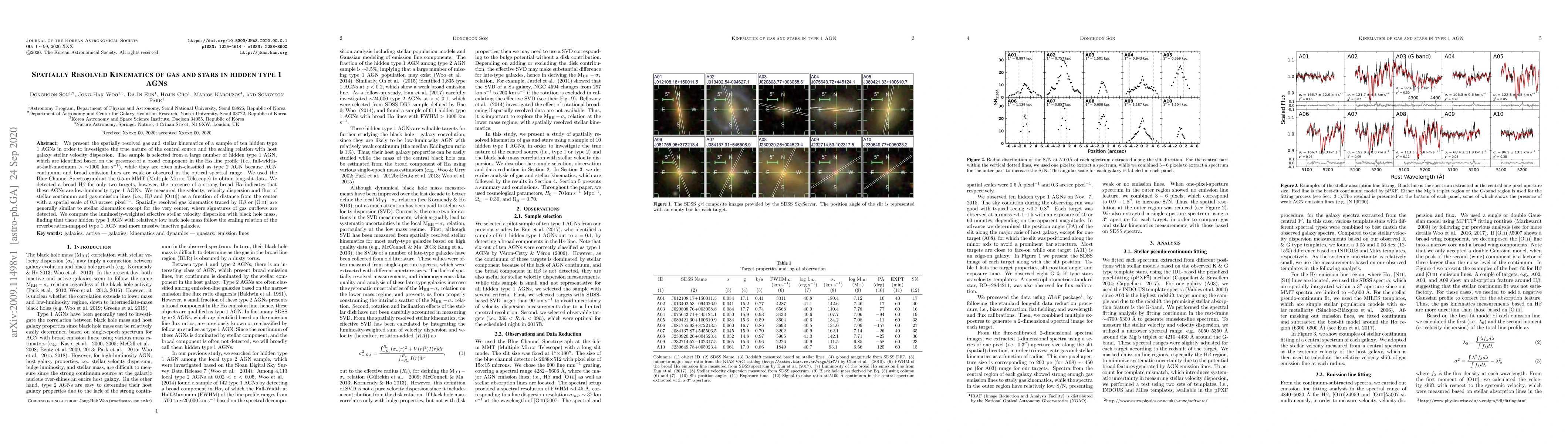 We present the spatially resolved gas and stellar kinematics of a sample of ten hidden type 1 AGNs in order to investigate the true nature of the central source and the scaling relation with host galaxy stellar velocity dispersion. The sample is selected from a large number of hidden type 1 AGN, which are identified based on the presence of a broad component in the \ha\ line profile (i.e., full-width-at-half-maximum $>$ $\sim$1000 \kms), while they are often mis-classified as type 2 AGN because AGN continuum and broad emission lines are weak or obscured in the optical spectral range. We used the Blue Channel Spectrograph at the 6.5-m MMT (Multiple Mirror Telescope) to obtain long-slit data. We detected a broad \hb\ for only two targets, however, the presence of a strong broad \ha\ indicates that these AGNs are low-luminosity type 1 AGNs. We measured the velocity, velocity dispersion and flux of stellar continuum and gas emission lines (i.e., \hb\ and \oiii) as a function of distance from the center with a spatial scale of 0.3 arcsec pixel$^{-1}$. Spatially resolved gas kinematics traced by \hb\ or \oiii\ are generally similar to stellar kinematics except for the very center, where signatures of gas outflows are detected. We compare the luminosity-weighted effective stellar velocity dispersion with black hole mass, finding that these hidden type 1 AGN with relatively low back hole mass follow the scaling relation of the reverberation-mapped type 1 AGN and more massive inactive galaxies. }