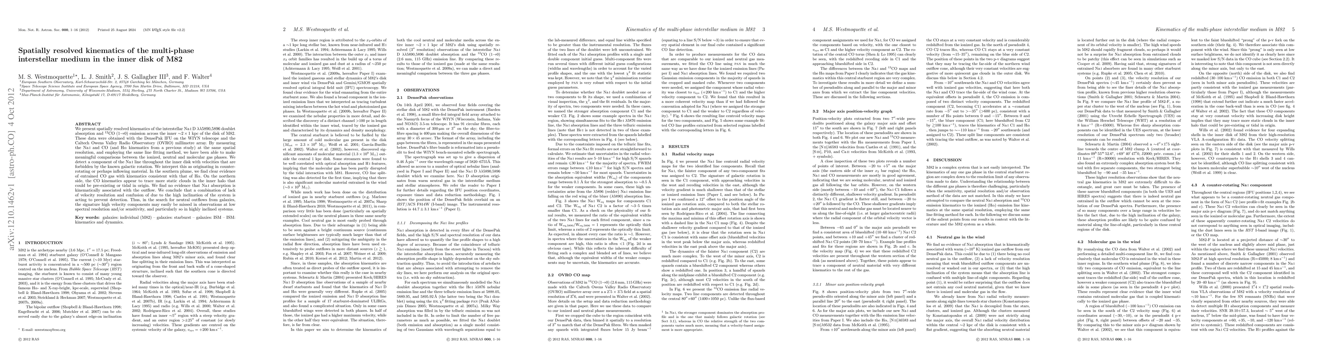 We present spatially resolved kinematics of the interstellar NaI D 5890,5896 doublet absorption and 12CO(1-0) emission across the inner ~2x1 kpc of the disk of M82. These data were obtained with the DensePak IFU on the WIYN telescope and the Caltech Owens Valley Radio Observatory (OVRO) millimetre array. By measuring the NaI and CO (and Halpha kinematics from a previous study) at the same spatial resolution, and employing the same line fitting method, we have been able to make meaningful comparisons between the ionized, neutral and molecular gas phases. We detect a component of the NaI line throughout the inner disk with velocities that are forbidden by the known galactic rotation. We interpret this as originating in counter-rotating or perhaps inflowing material. In the southern plume, we find clear evidence of entrained CO gas with kinematics consistent with that of Halpha. On the northern side, the CO kinematics appear to trace more static clouds in the inner halo that could be pre-existing or tidal in origin. We find no evidence that NaI absorption is kinematically associated with the outflow. We conclude that a combination of lack of velocity resolution and confusion of due to the high inclination of the system is acting to prevent detection. Thus, in the search for neutral outflows from galaxies, the signature high velocity components may easily be missed in observations at low spectral resolution and/or sensitivity, and particularly so in highly inclined systems.