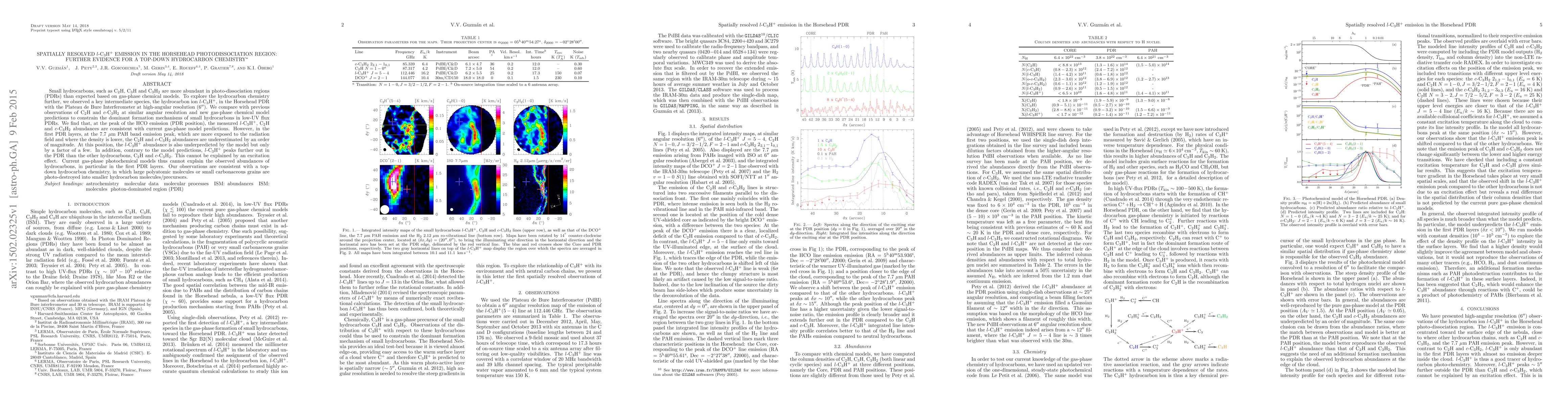This study investigates the spatially resolved l-C3H+ emission in the Horsehead photodissociation region, finding that current gas-phase models underpredict the abundances of small hydrocarbons like C2H and c-C3H2 in the first PDR layers. The observations support a top-down hydrocarbon chemistry model, where large molecules are photo-destroyed into smaller hydrocarbon precursors.