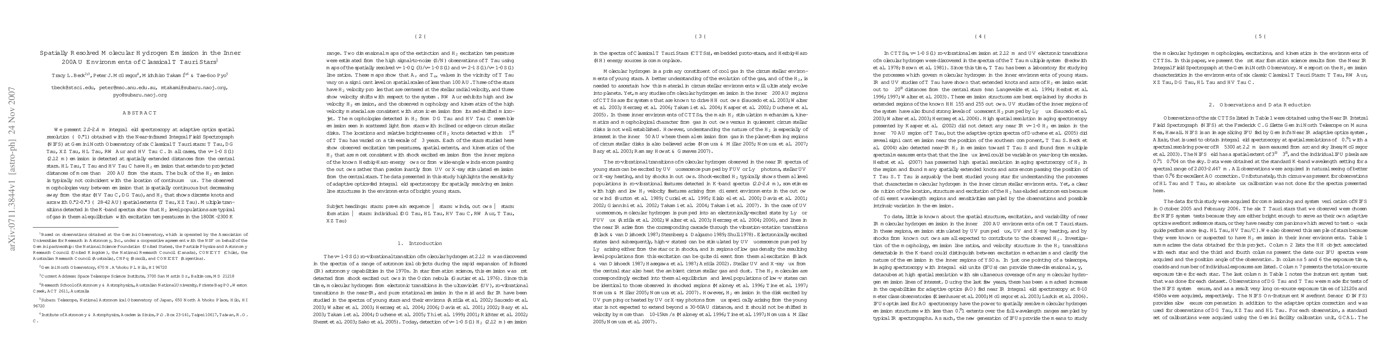This study uses adaptive optics integral field spectroscopy to detect spatially resolved H_2 emission from six Classical T Tauri stars, revealing that the emission is typically not coincident with the central stars and is likely from shock-excited gas rather than UV or X-ray stimulated emission. The findings underscore the capability of adaptive optics for resolving emission structures around young stars.