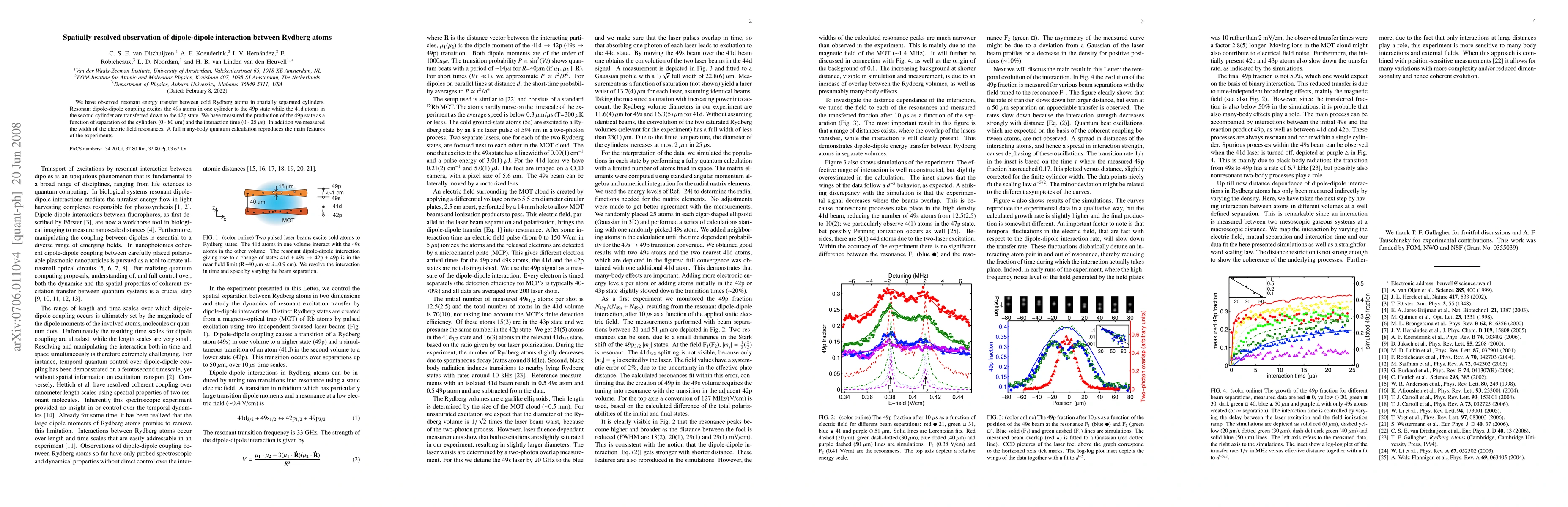 This study observes resonant energy transfer between spatially separated cold Rydberg atoms in cylinders, demonstrating dipole-dipole interaction. The experiment measures the excitation of 49s atoms to 49p state and the de-excitation of 41d atoms to 42p state, with results validated by a many-body quantum calculation.