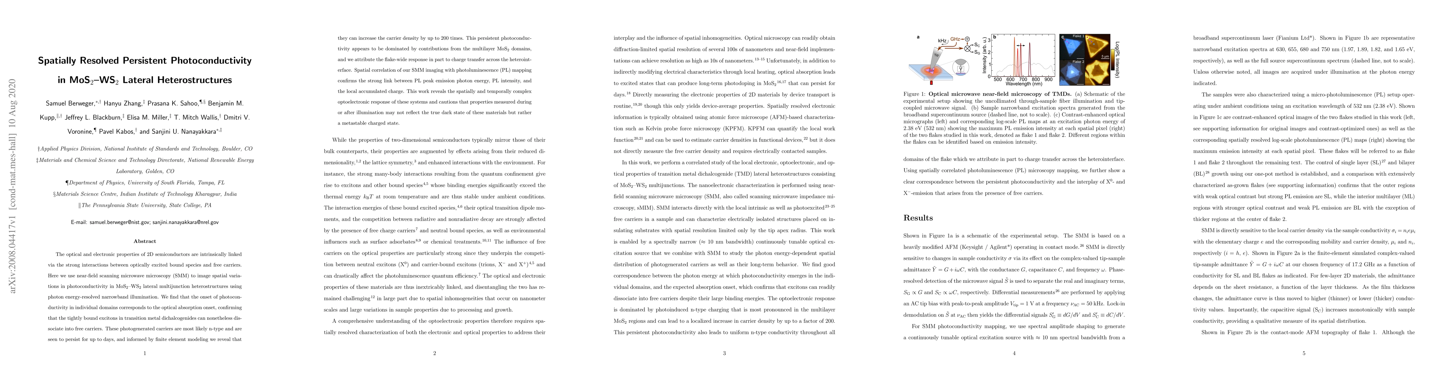 The optical and electronic properties of 2D semiconductors are intrinsically linked via the strong interactions between optically excited bound species and free carriers. Here we use near-field scanning microwave microscopy (SMM) to image spatial variations in photoconductivity in MoS$_2$--WS$_2$ lateral multijunction heterostructures using photon energy-resolved narrowband illumination. We find that the onset of photoconductivity in individual domains corresponds to the optical absorption onset, confirming that the tightly bound excitons in transition metal dichalcogenides can nonetheless dissociate into free carriers. These photogenerated carriers are most likely n-type and are seen to persist for up to days, and informed by finite element modeling we reveal that they can increase the carrier density by up to 200 times. This persistent photoconductivity appears to be dominated by contributions from the multilayer MoS$_2$ domains, and we attribute the flake-wide response in part to charge transfer across the heterointerface. Spatial correlation of our SMM imaging with photoluminescence (PL) mapping confirms the strong link between PL peak emission photon energy, PL intensity, and the local accumulated charge. This work reveals the spatially and temporally complex optoelectronic response of these systems and cautions that properties measured during or after illumination may not reflect the true dark state of these materials but rather a metastable charged state.