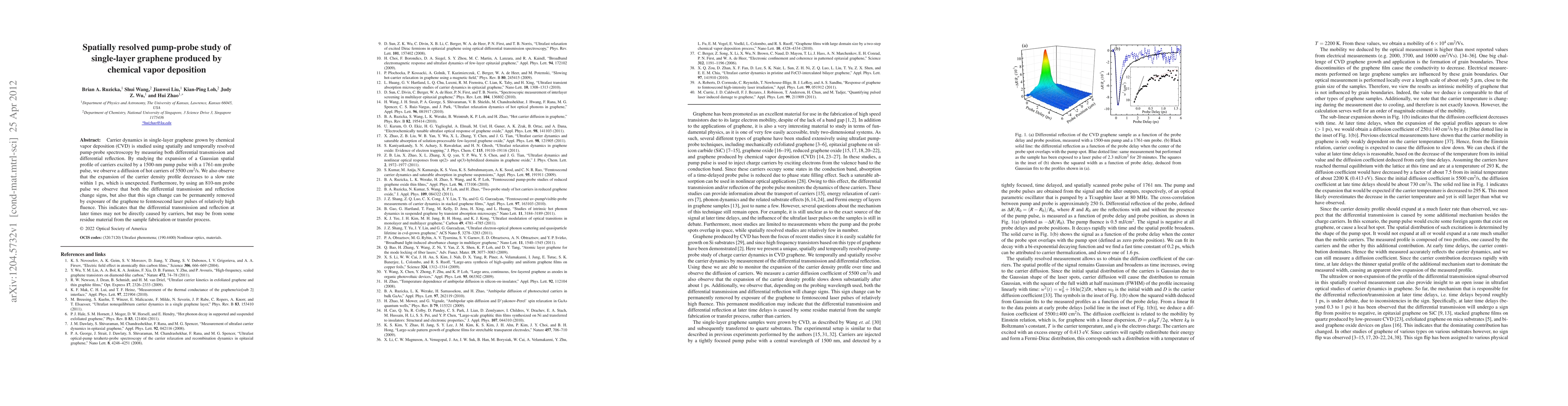 Carrier dynamics in single-layer graphene grown by chemical vapor deposition (CVD) is studied using spatially and temporally resolved pump-probe spectroscopy by measuring both differential transmission and differential reflection. By studying the expansion of a Gaussian spatial profile of carriers excited by a 1500-nm pump pulse with a 1761-nm probe pulse, we observe a diffusion of hot carriers of 5500 square centimeter per second. We also observe that the expansion of the carrier density profile decreases to a slow rate within 1 ps, which is unexpected. Furthermore, by using an 810-nm probe pulse we observe that both the differential transmission and reflection change signs, but also that this sign change can be permanently removed by exposure of the graphene to femtosecond laser pulses of relatively high fluence. This indicates that the differential transmission and reflection at later times may not be directly caused by carriers, but may be from some residue material from the sample fabrication or transfer process.
