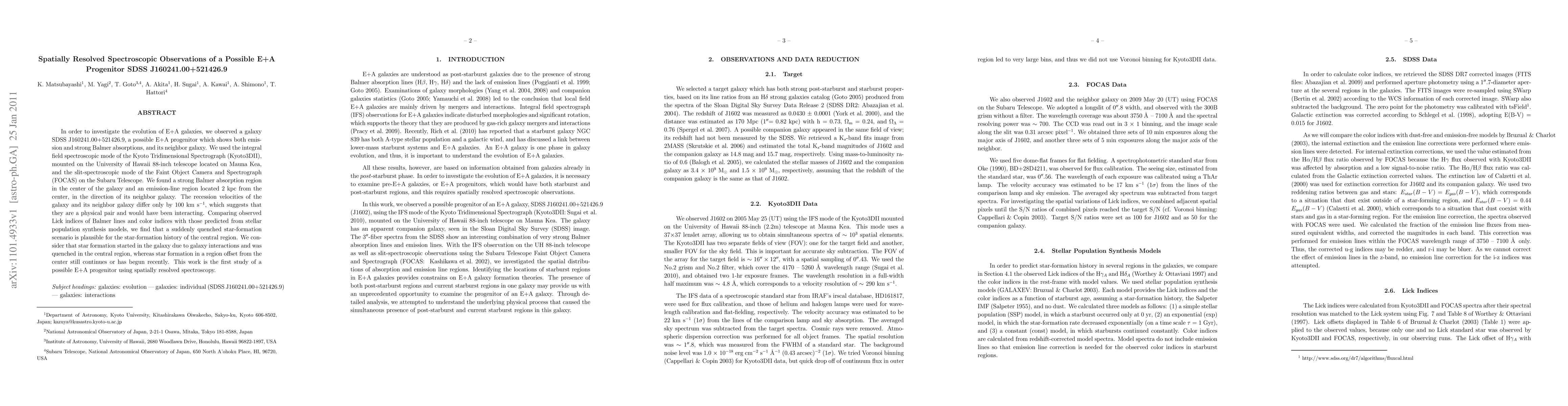 In order to investigate the evolution of E+A galaxies, we observed a galaxy SDSS J160241.00+521426.9, a possible E+A progenitor which shows both emission and strong Balmer absorptions, and its neighbor galaxy. We used the integral field spectroscopic mode of the Kyoto Tridimensional Spectrograph (Kyoto3DII), mounted on the University of Hawaii 88-inch telescope located on Mauna Kea, and the slit-spectroscopic mode of the Faint Object Camera and Spectrograph (FOCAS) on the Subaru Telescope. We found a strong Balmer absorption region in the center of the galaxy and an emission-line region located 2 kpc from the center, in the direction of its neighbor galaxy. The recession velocities of the galaxy and its neighbor galaxy differ only by 100 km s^-1, which suggests that they are a physical pair and would have been interacting. Comparing observed Lick indices of Balmer lines and color indices with those predicted from stellar population synthesis models, we find that a suddenly quenched star-formation scenario is plausible for the star-formation history of the central region. We consider that star formation started in the galaxy due to galaxy interactions and was quenched in the central region, whereas star formation in a region offset from the center still continues or has begun recently. This work is the first study of a possible E+A progenitor using spatially resolved spectroscopy.