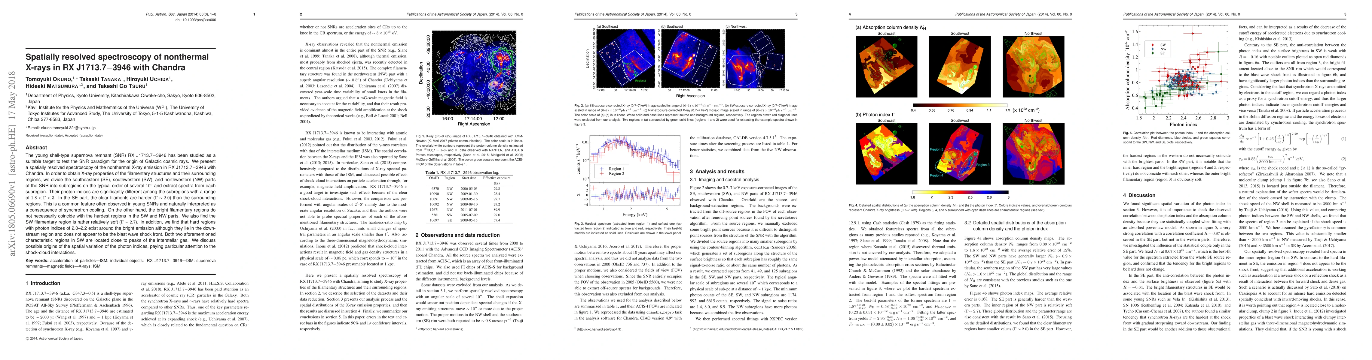 The young shell-type supernova remnant (SNR) RX J1713.7-3946 has been studied as a suitable target to test the SNR paradigm for the origin of Galactic cosmic rays. We present a spatially resolved spectroscopy of the nonthermal X-ray emission in RX J1713.7-3946 with Chandra. In order to obtain X-ray properties of the filamentary structures and their surrounding regions, we divide the southeastern (SE), southwestern (SW), and northwestern (NW) parts of the SNR into subregions on the typical order of several 10" and extract spectra from each subregion. Their photon indices are significantly different among the subregions with a range of 1.8 < {\Gamma} < 3. In the SE part, the clear filaments are harder ({\Gamma} ~ 2.0) than the surrounding regions. This is a common feature often observed in young SNRs and naturally interpreted as a consequence of synchrotron cooling. On the other hand, the bright filamentary regions do not necessarily coincide with the hardest regions in the SW and NW parts. We also find the SW filamentary region is rather relatively soft ({\Gamma} ~ 2.7). In addition, we find that hard regions with photon indices of 2.0-2.2 exist around the bright emission although they lie in the downstream region and does not appear to be the blast wave shock front. Both two aforementioned characteristic regions in SW are located close to peaks of the interstellar gas. We discuss possible origins of the spatial variation of the photon indices, paying particular attention to the shock-cloud interactions.