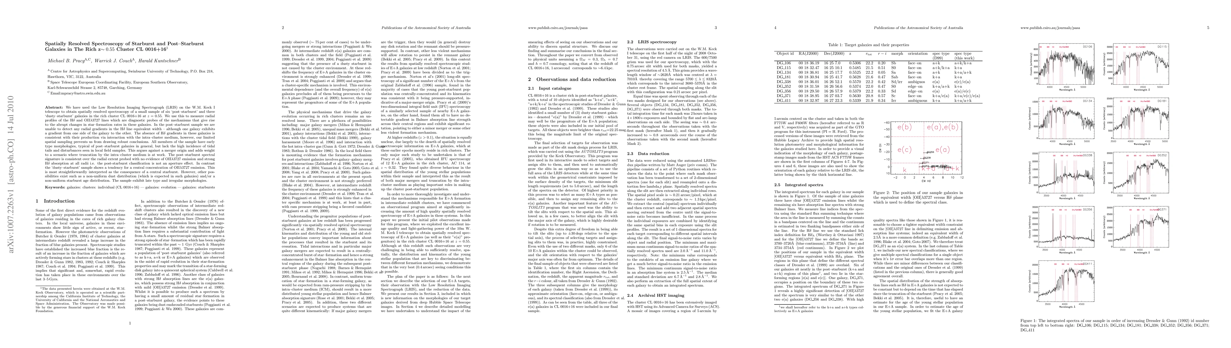 This study uses spatially resolved spectroscopy to analyze six post-starburst and three dusty-starburst galaxies in the cluster CL0016+16, finding no radial gradients in Hdelta lines for post-starburst galaxies, suggesting truncation by the intra-cluster medium, while dusty-starburst galaxies show central OII3727 emission indicative of central starburst activity.