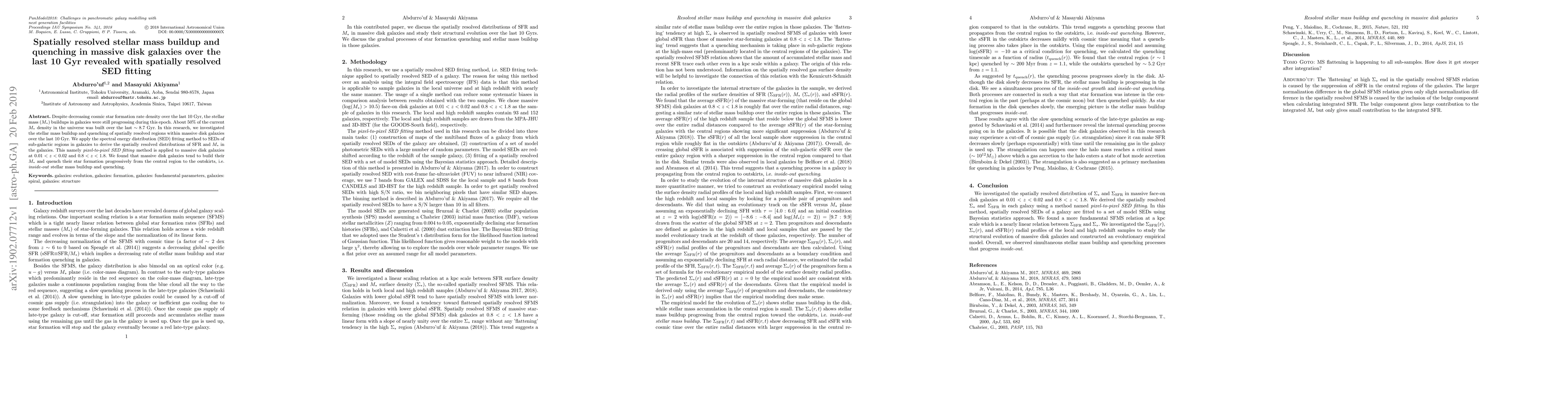 This study uses spatially resolved SED fitting to analyze stellar mass buildup and quenching in massive disk galaxies over the last 10 Gyr, revealing an "inside-out" pattern where galaxies build their stellar mass and quench star formation progressively from the center to the outskirts. About 50% of the current stellar mass density was accumulated in the last 8.7 Gyr.
