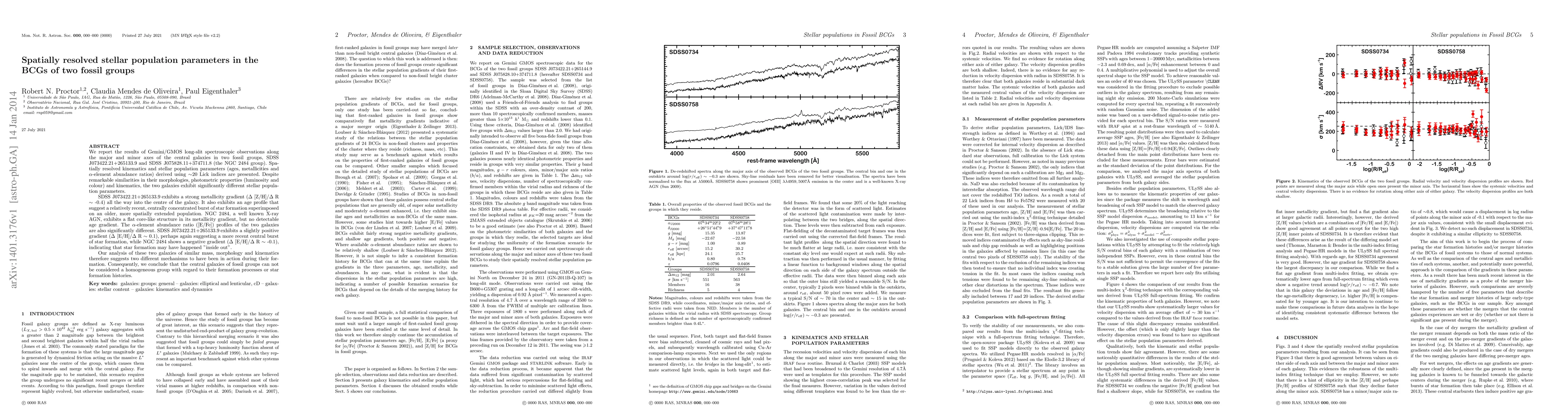 Two fossil group galaxies have distinct stellar population parameters despite similarities in morphology and kinematics, suggesting different formation mechanisms.