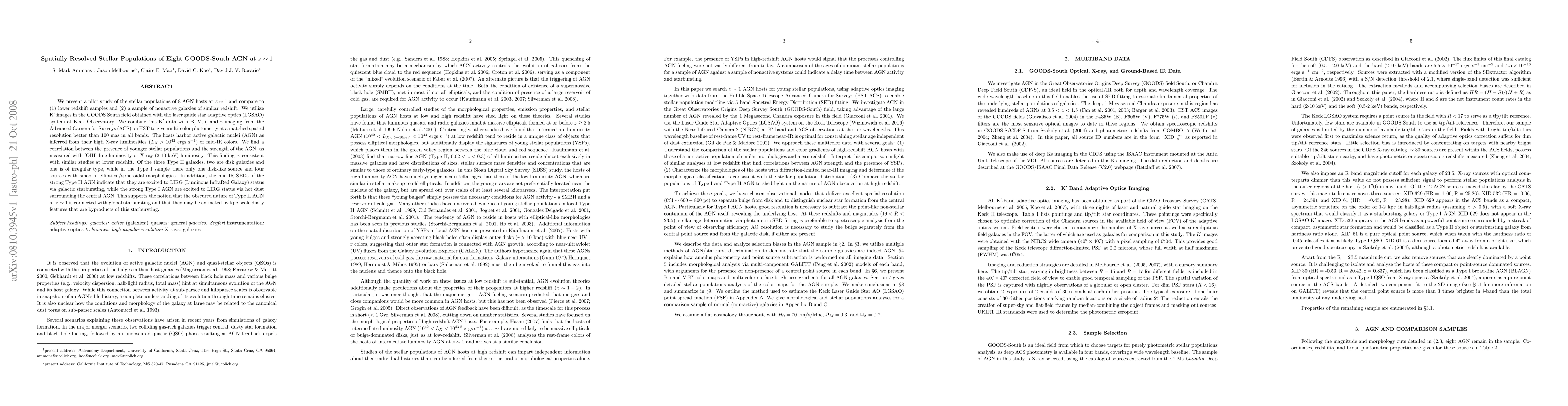 We present a pilot study of the stellar populations of 8 AGN hosts at z~1 and compare to (1) lower redshift samples and (2) a sample of nonactive galaxies of similar redshift. We utilize K' images in the GOODS South field obtained with the laser guide star adaptive optics (LGSAO) system at Keck Observatory. We combine this K' data with B, V, i, and z imaging from the ACS on HST to give multi-color photometry at a matched spatial resolution better than 100 mas in all bands. The hosts harbor AGN as inferred from their high X-ray luminosities (L_X > 10^42 ergs/s) or mid-IR colors. We find a correlation between the presence of younger stellar populations and the strength of the AGN, as measured with [OIII] line luminosity or X-ray (2-10 keV) luminosity. This finding is consistent with similar studies at lower redshift. Of the three Type II galaxies, two are disk galaxies and one is of irregular type, while in the Type I sample there only one disk-like source and four sources with smooth, elliptical/spheroidal morphologies. In addition, the mid-IR SEDs of the strong Type II AGN indicate that they are excited to LIRG (Luminous InfraRed Galaxy) status via galactic starbursting, while the strong Type I AGN are excited to LIRG status via hot dust surrounding the central AGN. This supports the notion that the obscured nature of Type II AGN at z~1 is connected with global starbursting and that they may be extincted by kpc-scale dusty features that are byproducts of this starbursting.