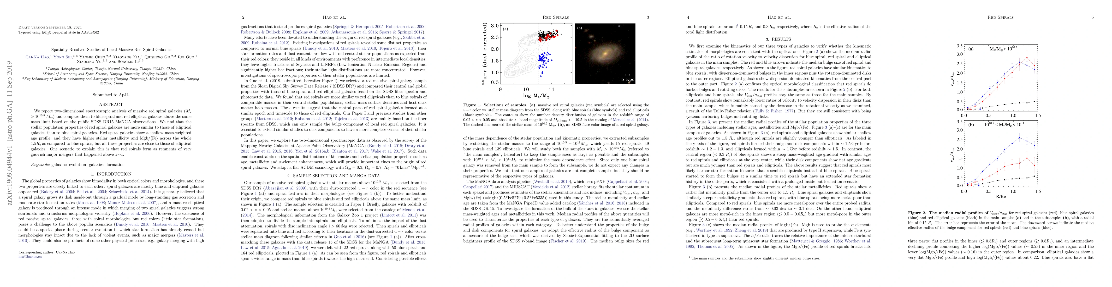 This study uses two-dimensional spectroscopy from SDSS DR15 MaNGA to analyze massive red spiral galaxies, finding their stellar population properties more akin to elliptical galaxies than blue spirals. The red spirals exhibit shallow age profiles, higher metallicity, and Mgb/⟨Fe⟩ ratios, suggesting they may result from gas-rich major mergers above z~1.